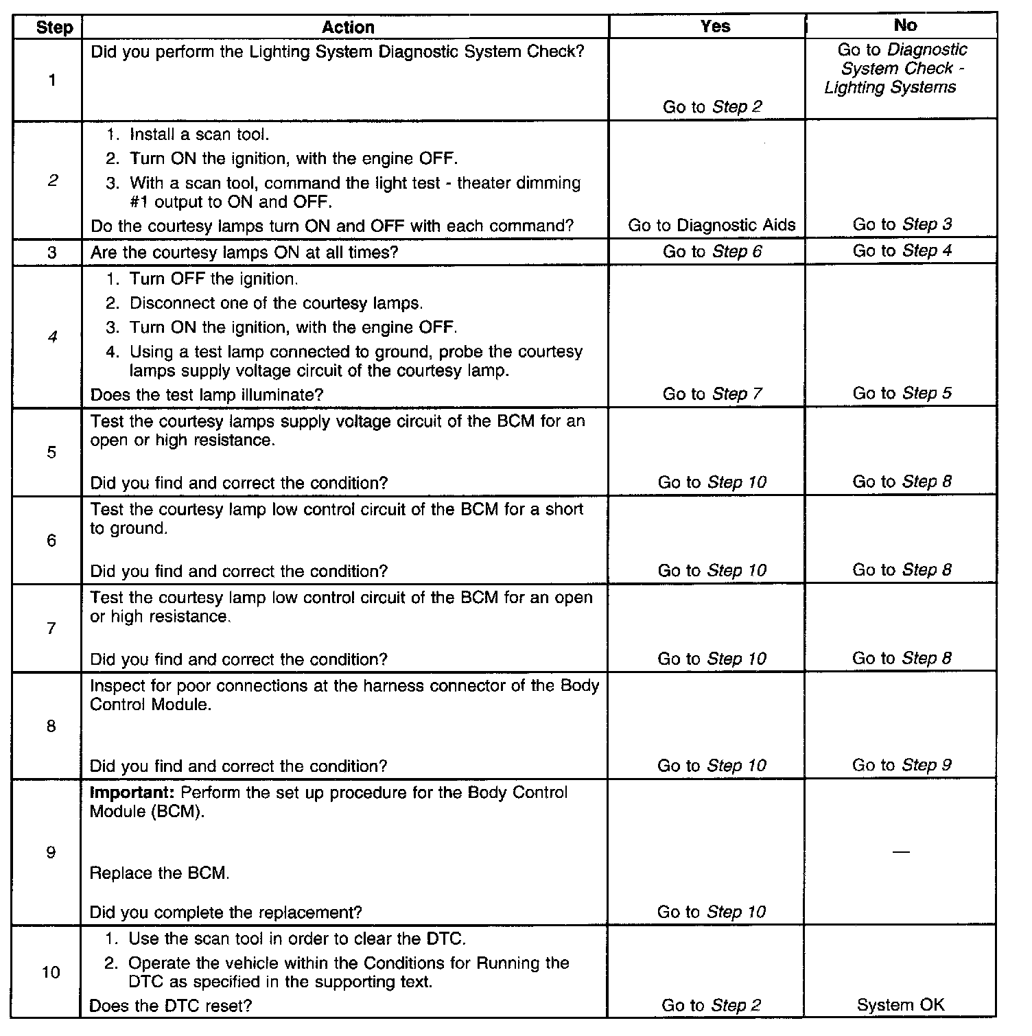 - The BCM detects that the output for the courtesy lamp low control circuit is low when it is expected to be high.