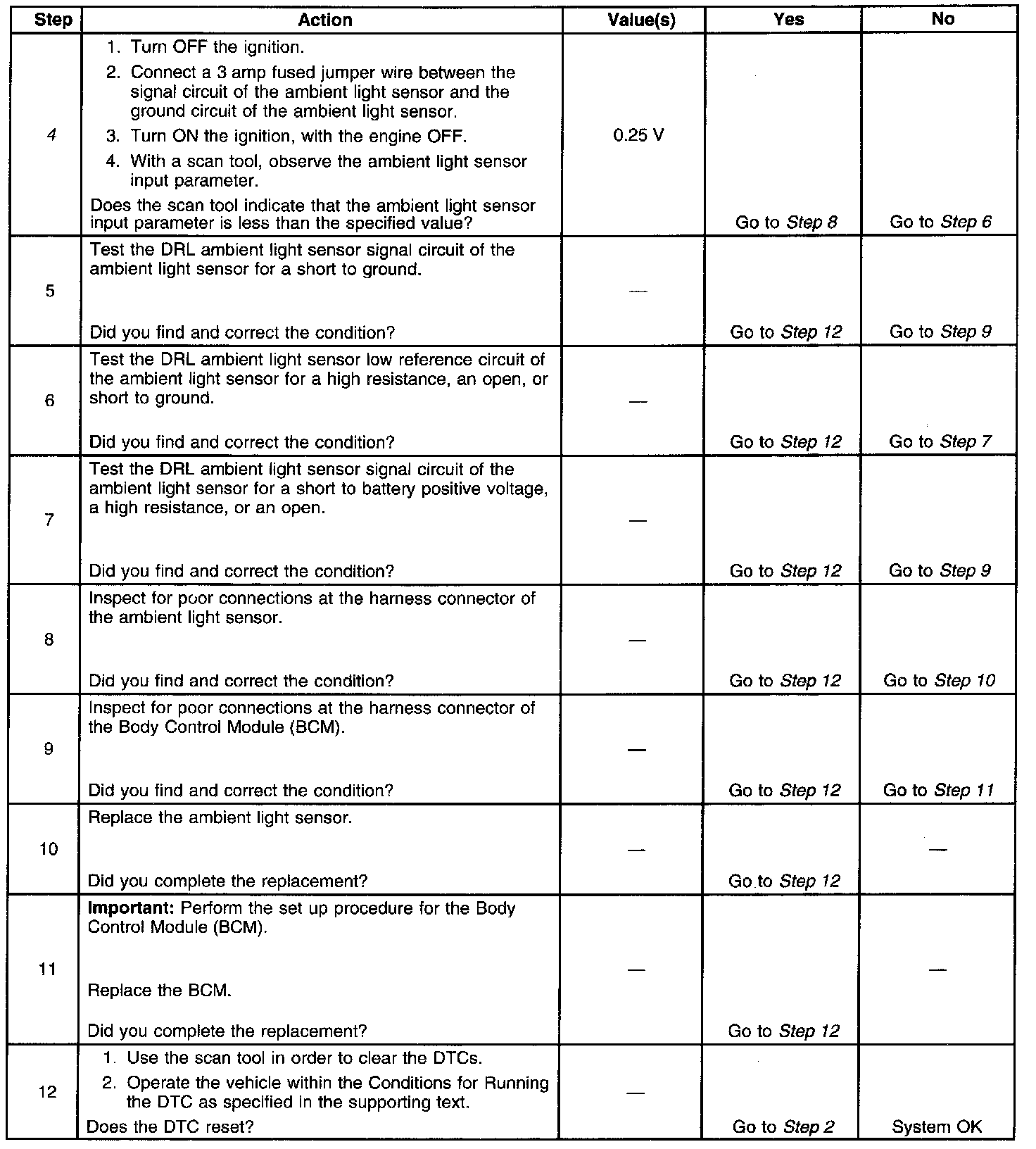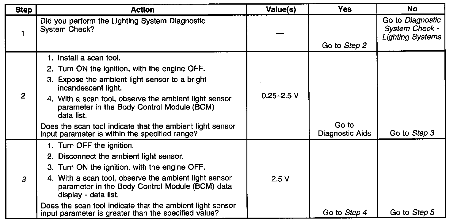 - The BCM no longer detects a short to ground in the DRL ambient light sensor signal circuit.