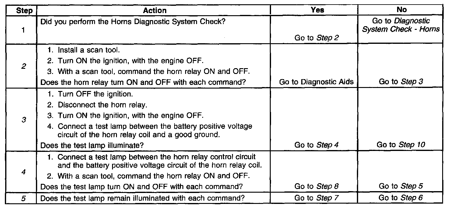 2. Listen for an audible click when the horn relay operates. Command both the ON and OFF states. Repeat the commands as necessary.