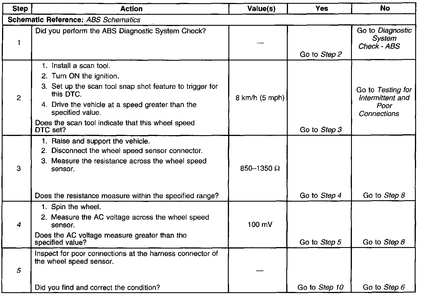 5. Ensures that the wheel speed sensor is generating a valid AC voltage output.