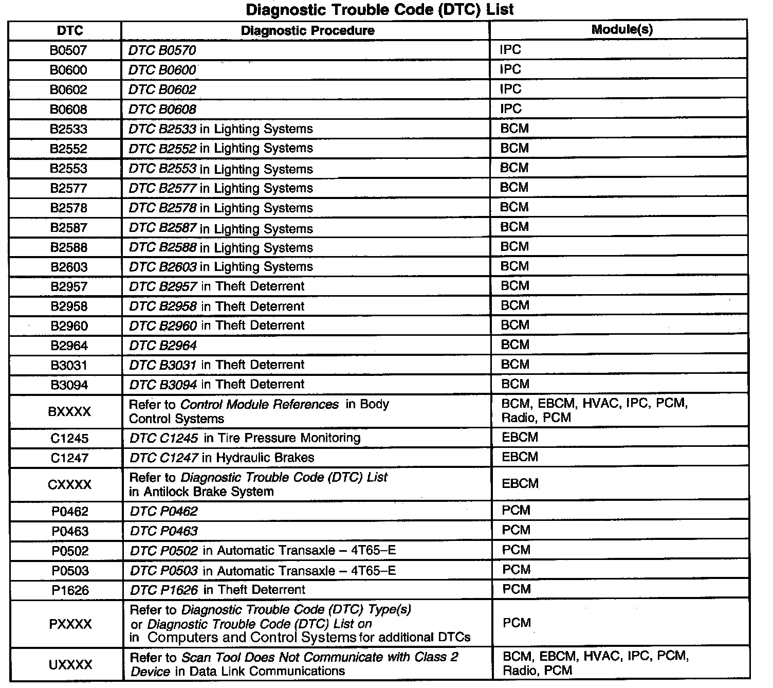 DTCs B0507 - UXXX: