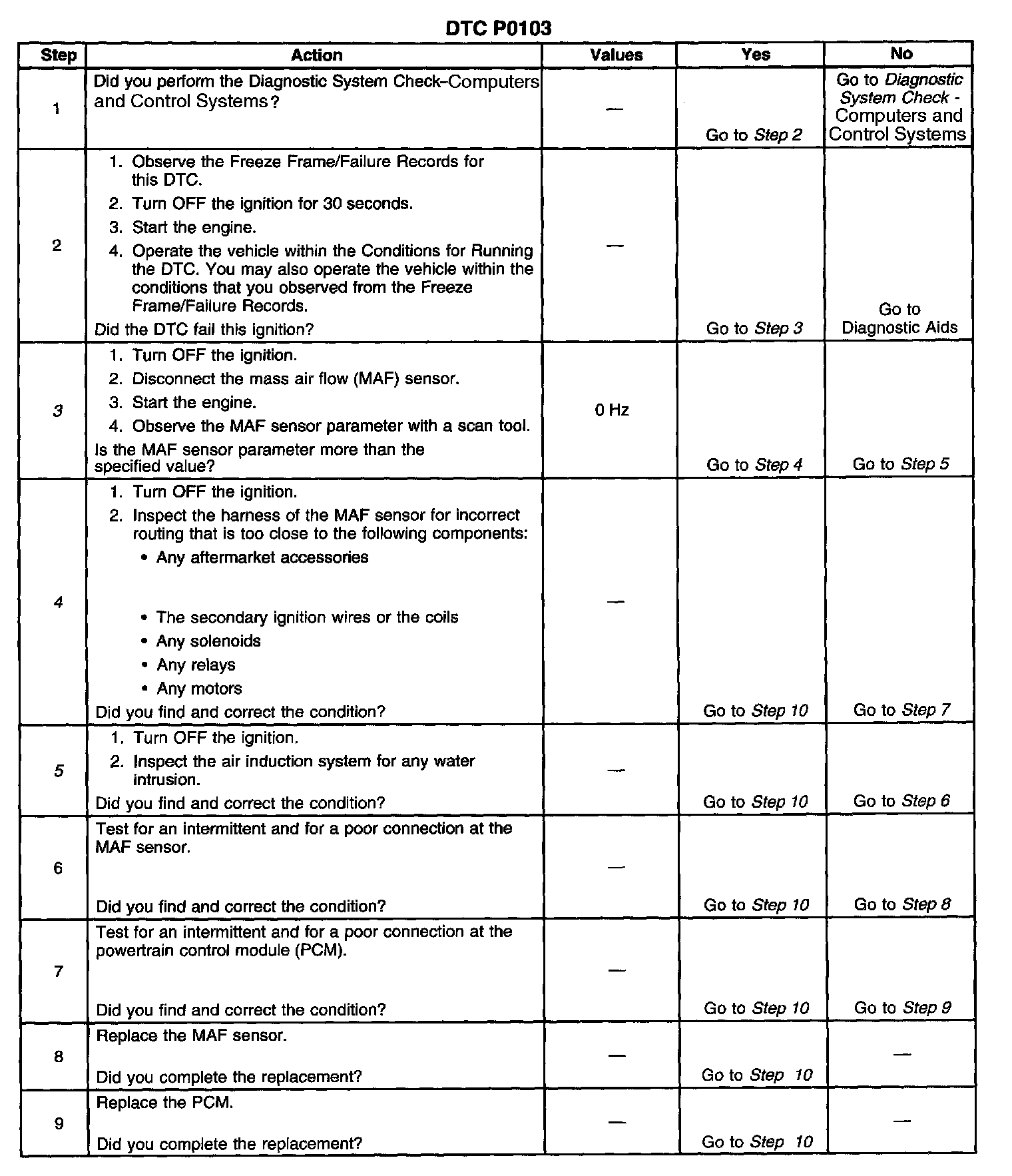 The PCM applies a voltage to the sensor on the signal circuit. The sensor uses the voltage to produce a frequency based on the inlet air flow through the sensor bore. The frequency varies within a range of near 2,000 Hertz at idle to near 10,000 Hertz at maximum engine load. If the PCM detects a frequency signal more than the possible range of a correctly operating MAF sensor DTC P0103 sets.