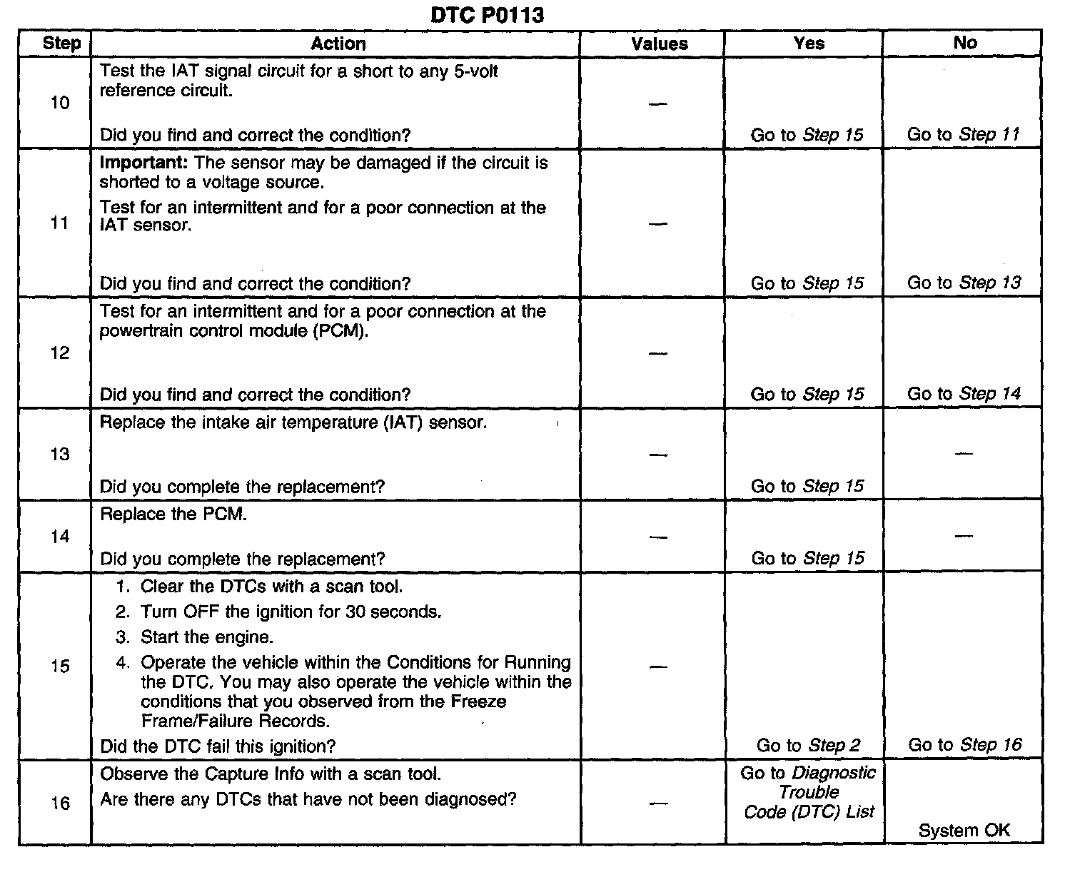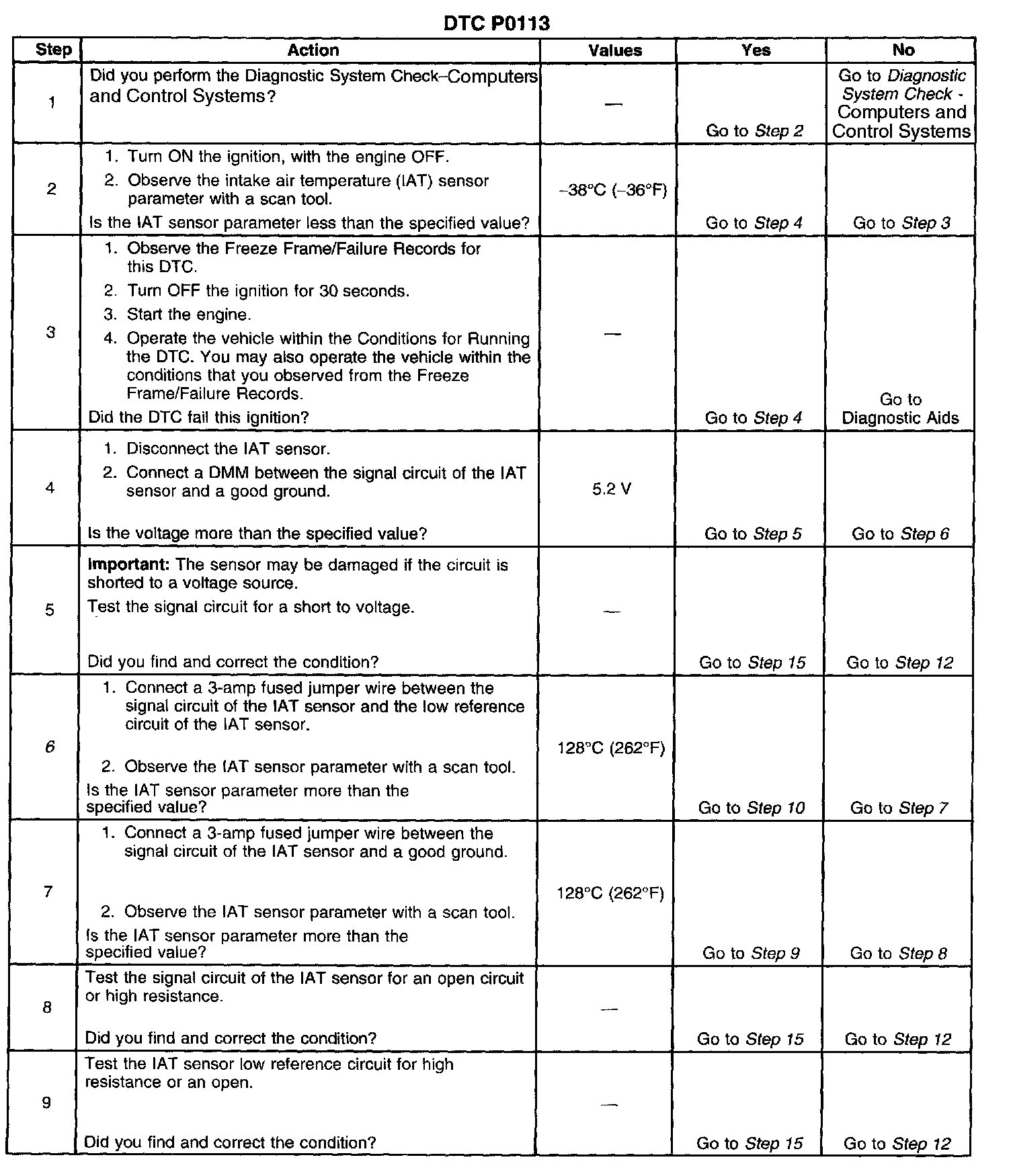 The intake air temperature (IAT) sensor is a variable resistor. The AT sensor has a signal circuit and a low reference circuit. The AT sensor measures the temperature of the air entering the engine. The powertrain control module (PCM) supplies 5 volts to the IAT signal circuit and a ground for the IAT low reference circuit. When the AT sensor is cold, the sensor resistance is high. When the air temperature increases, the sensor resistance decreases. With high sensor resistance, the PCM detects a high voltage on the IAT signal circuit. With lower sensor resistance, the PCM detects a lower voltage on the IAT signal circuit. If the PCM detects an excessively high IAT signal voltage, indicating a low temperature, DTC P0113 sets.