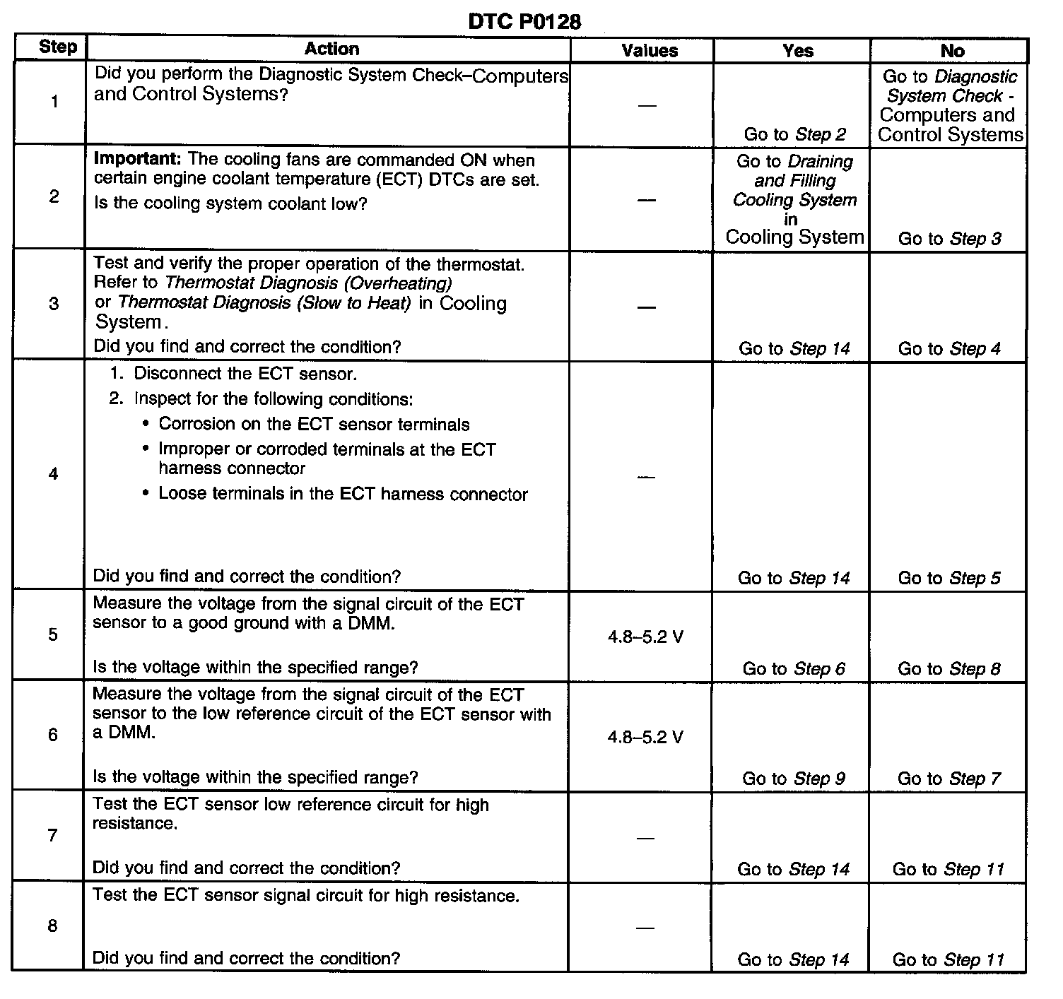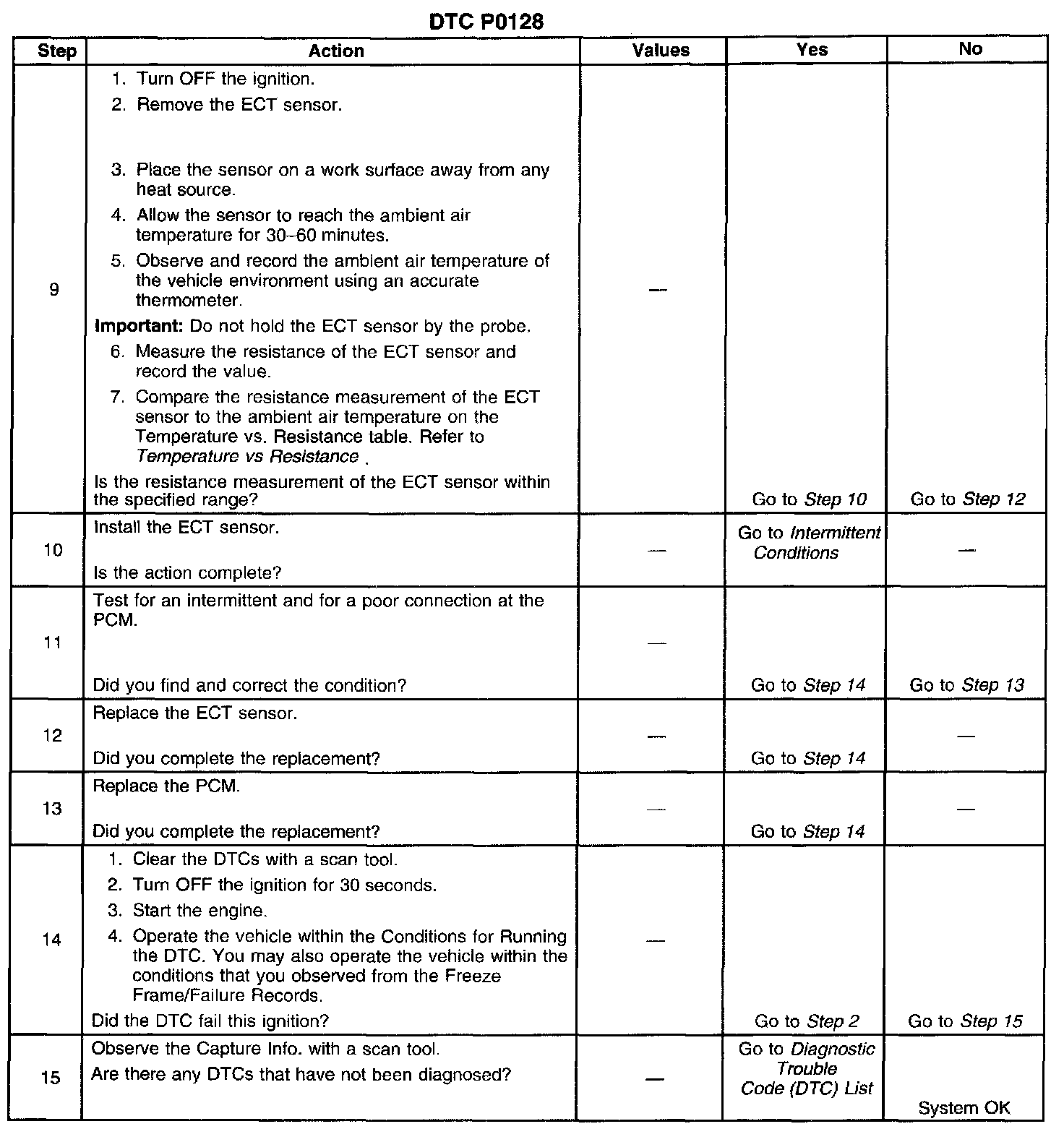 This DTC will only run once per ignition cycle within the enabling condition. If the PCM detects the calibrated amount of air flow and engine run time have been met, and the ECT has not met the minimum thermostat regulating temperature, DTC P0128 sets.