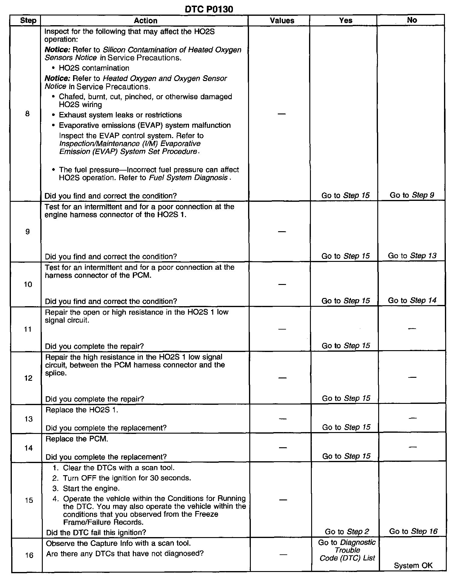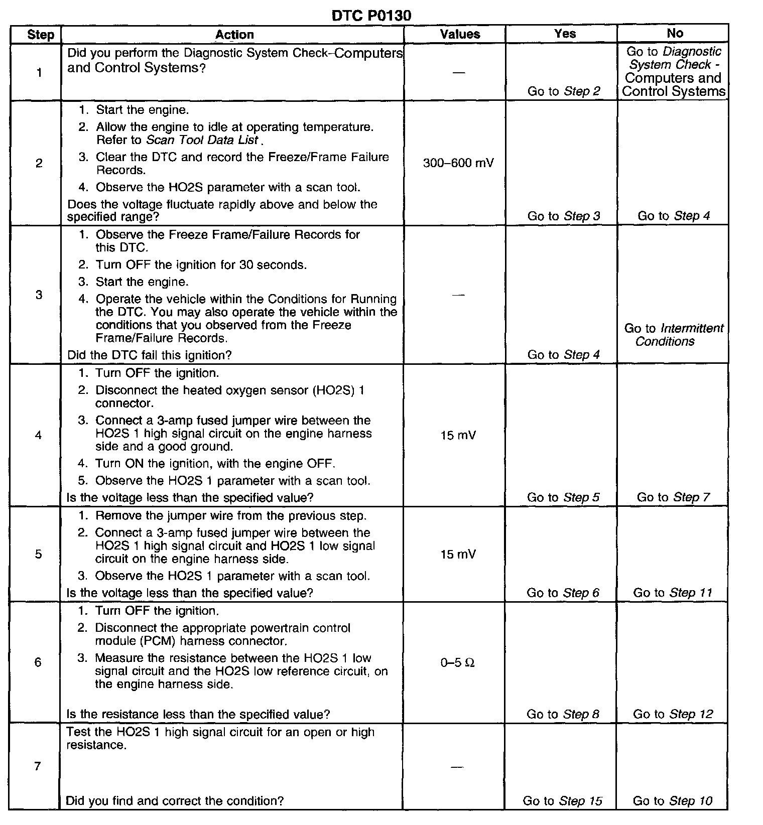 Heated oxygen sensors (HO2S) are used for fuel control and post catalyst monitoring. Each HO2S compares the oxygen content of the surrounding air with the oxygen content of the exhaust stream. When the vehicle is first started, the powertrain control module (PCM) operates in an Open Loop mode, ignoring the HO2S signal voltage when calculating the air-to-fuel ratio. The PCM supplies the HO2S with a reference, or bias, voltage of about 450 mV. The HO2S generates a voltage within a range of 0-1,000 mV that fluctuates above and below bias voltage once the sensor reaches operating temperature. A high HO2S voltage output indicates a rich fuel mixture. A low HO2S voltage output indicates a lean mixture. Heating elements inside the HO2S minimize the time required for the sensors to reach operating temperature, and provide an accurate voltage signal. If the PCM detects an active HO2S 1 signal of a lower than calibrated minimum amplitude, DTC P0130 will set.