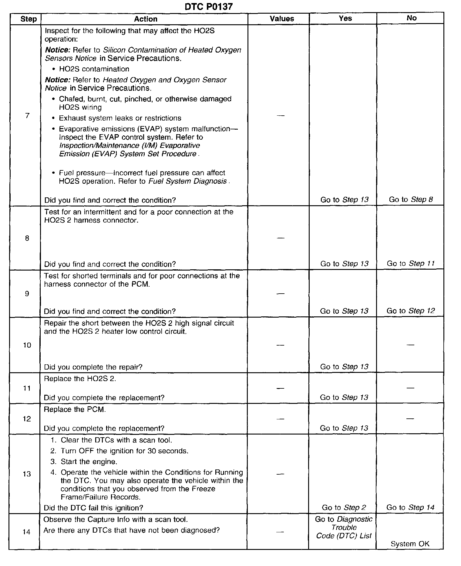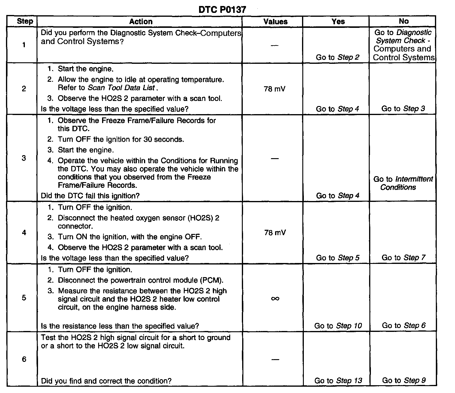 Heated oxygen sensors (HO2S) are used for fuel control and post catalyst monitoring. Each HO2S compares the oxygen content of the surrounding air with the oxygen content of the exhaust stream. When the vehicle is first started, the powertrain control module (PCM) operates in an Open Loop mode, ignoring the HO2S signal voltage when calculating the air-to-fuel ratio. The PCM supplies the HO2S with a reference or bias voltage of about 450 mV. The HO2S generates a voltage within a range of 0-1,000 mV that fluctuates above and below bias voltage once the sensor reaches operating temperature. A high HO2S voltage output indicates a rich fuel mixture. A low HO2S voltage output indicates a lean mixture. Heating elements inside the HO2S minimize the time required for the sensors to reach operating temperature and provide an accurate voltage signal. The HO2S 2 is used for post catalyst monitoring. If the PCM detects that the HO2S 2 voltage remains below a calibrated voltage for an excessive amount of time, DTC P0137 will set.