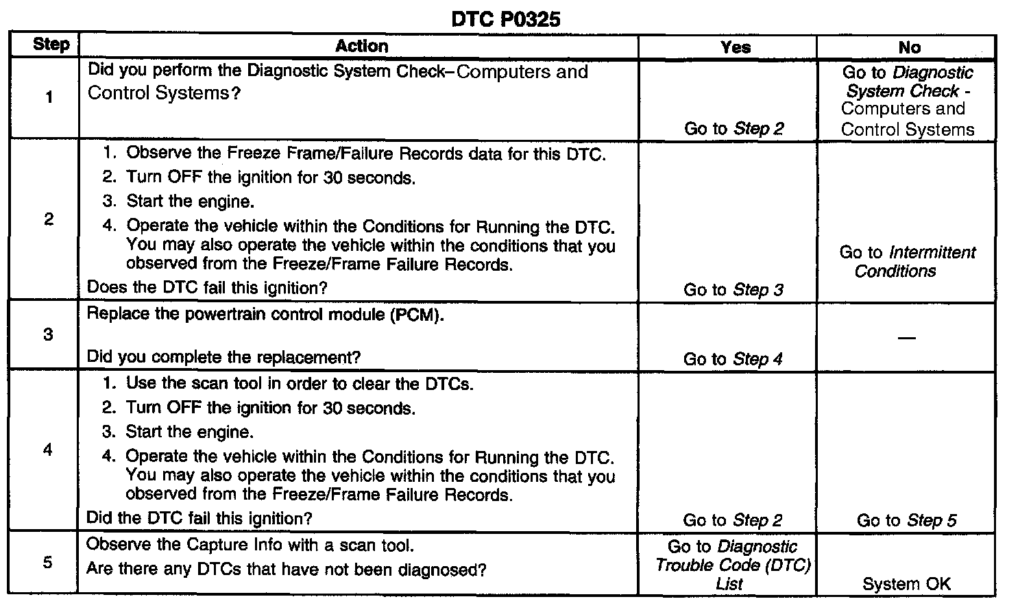 The knock sensor (KS) produces an AC voltage at all engine speeds and loads. Depending on the amplitude and frequency of the KS signal, the powertrain control module (PCM) will adjust the spark timing. The PCM uses the KS signal in order to calculate the average voltage. The PCM inspects the KS and the related wiring by comparing the actual knock signal to the assigned voltage range. If the KS system is operating correctly, the PCM should monitor the KS voltage that is varying above and below a predetermined average voltage. This DTC will set if the PCM malfunctions in a manner that will not allow proper diagnosis of the KS system.