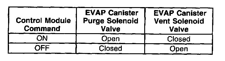 The table illustrates the relationship between the ON and OFF states, and the Open or Closed states of the EVAP canister purge and vent solenoid valves.