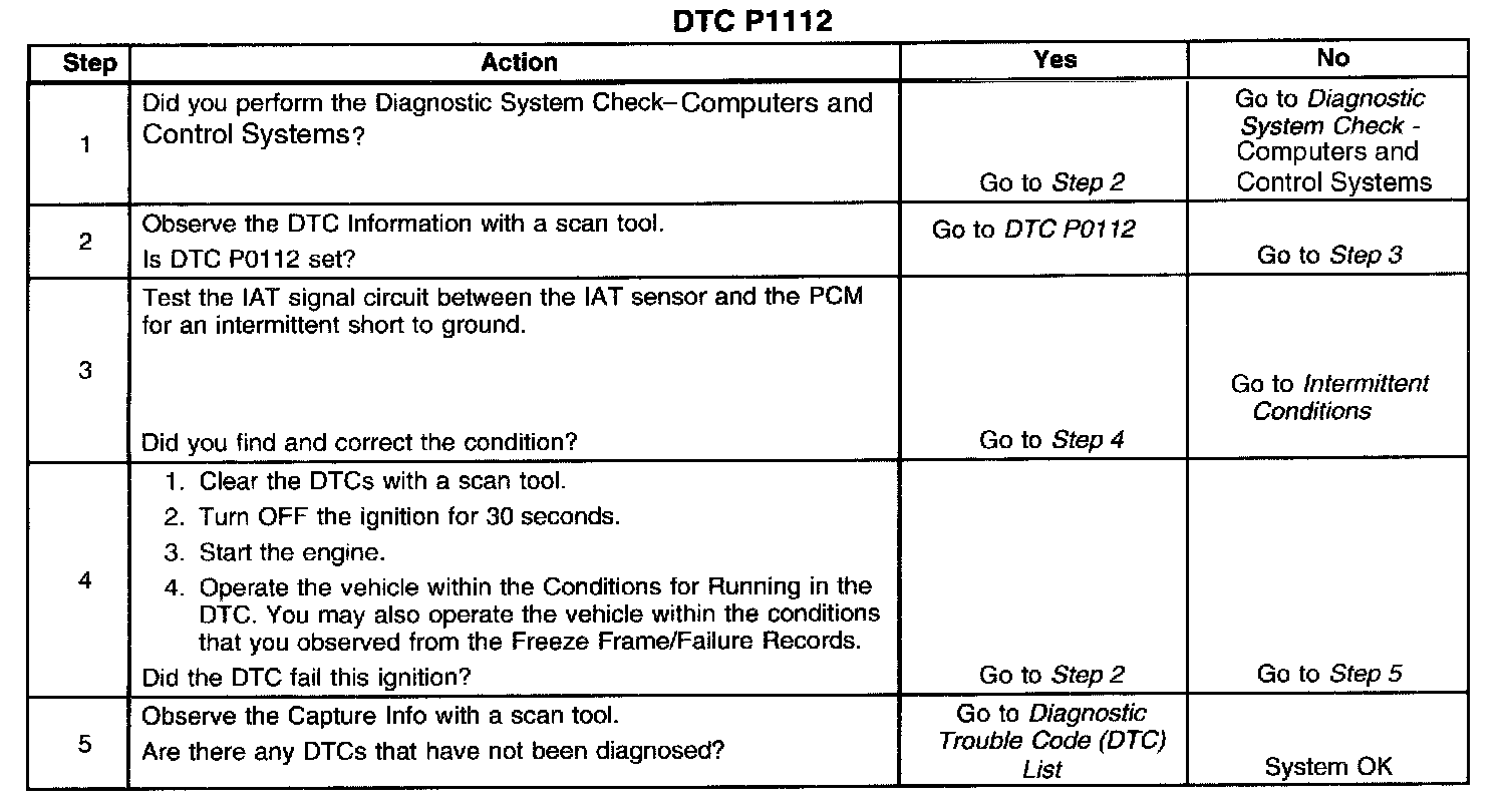 The intake air temperature (IAT) sensor is a variable resistor. The IAT sensor has a signal circuit and a low reference circuit. The IAT sensor measures the temperature of the air entering the engine. The powertrain control module (PCM) supplies 5 volts to the IAT signal circuit and a ground for the IAT low reference circuit. When the IAT sensor is cold, the sensor resistance is high. When the air temperature increases, the sensor resistance decreases. With high sensor resistance, the PCM detects a high voltage on the IAT signal circuit. With lower sensor resistance, the PCM detects a lower voltage on the IAT signal circuit. If the PCM detects an intermittent low IAT signal voltage, indicating a high temperature, DTC P1112 sets.