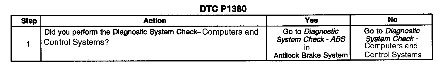 The powertrain control module (PCM) detects engine misfire events by monitoring variations in the crankshaft rotation speed. Wheel speed changes caused by rough road conditions can cause changes in crankshaft speed. By monitoring the wheel speed sensors, the anti-lock brake system (ABS) can determine if the vehicle is operating on a rough road. If the ABS is detecting a rough road condition severe enough to affect misfire detection, a rough road signal is sent to the PCM on the serial data circuit. If DTC P0300 is set and the rough road information is not available due to an ABS malfunction, DTC P1380 will set.