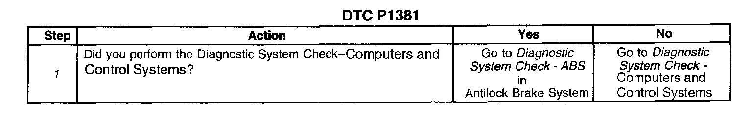 The powertrain control module (PCM) detects engine misfire events by monitoring variations in the crankshaft rotation speed. Wheel speed changes caused by rough road conditions can cause changes in crankshaft rotation speed. By monitoring the wheel speed sensors, the anti-lock brake system (ABS) can determine if the vehicle is operating on a rough road. If the ABS is detecting a rough road condition severe enough to effect misfire detection, a rough road signal is sent to the PCM on the serial data circuit. If DTC P0300 is set and the rough road information is not available due to an ABS malfunction or a serial data malfunction, DTC P1381 will set.