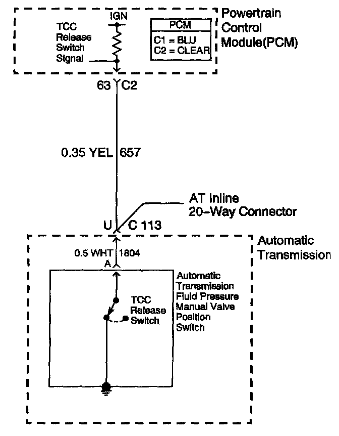 The switch signals the PCM that the TCC is released. This is accomplished by torque converter release fluid pressure acting on the switch contact which opens the circuit. When the circuit voltage is high, the PCM recognizes that the TCC is no longer engaged.
