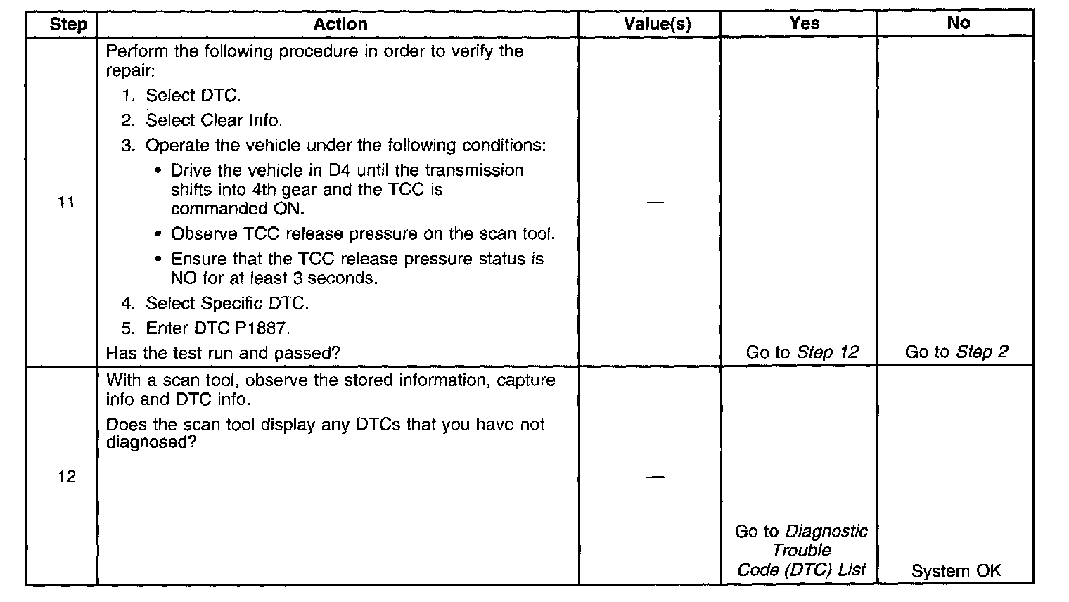 If the PCM determines that the TCC release switch is open indicating that the TCC is not applied and the TCC slip speed indicates that the TCC is applied then DTC P1887 sets. DTC P1887 is a type B DTC.