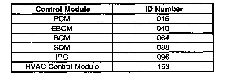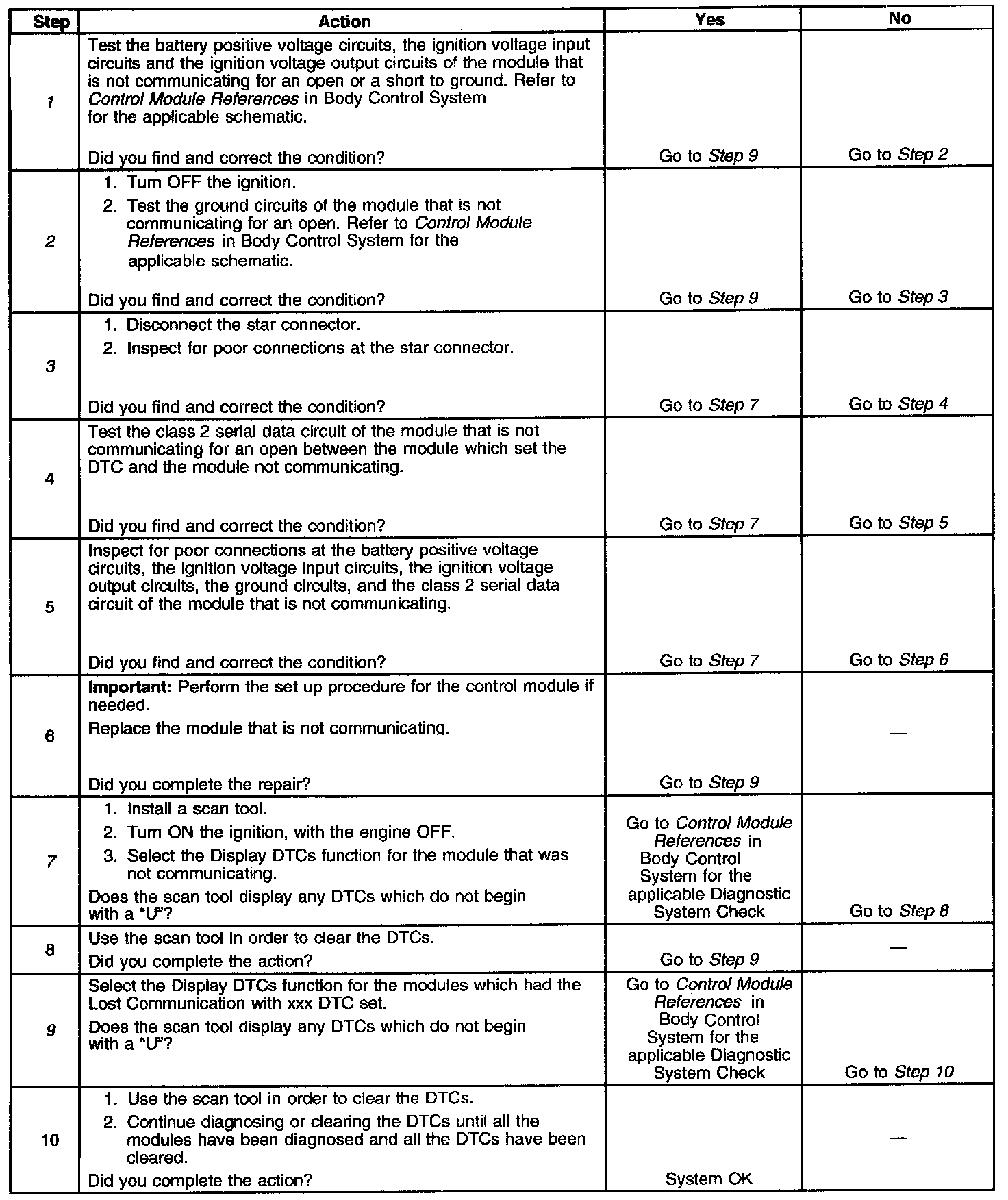 The Control Module ID Number list provides a method for determining which module is not communicating. A module with an internal class 2 serial data circuit malfunction or which loses power during the current ignition cycle would have a Lost Communication DTC set by other modules. The modules that can communicate will set a DTC indicating the module that cannot communicate. When no message is detected from a learned identification number for 5 seconds, a DTC U1xxx is set.