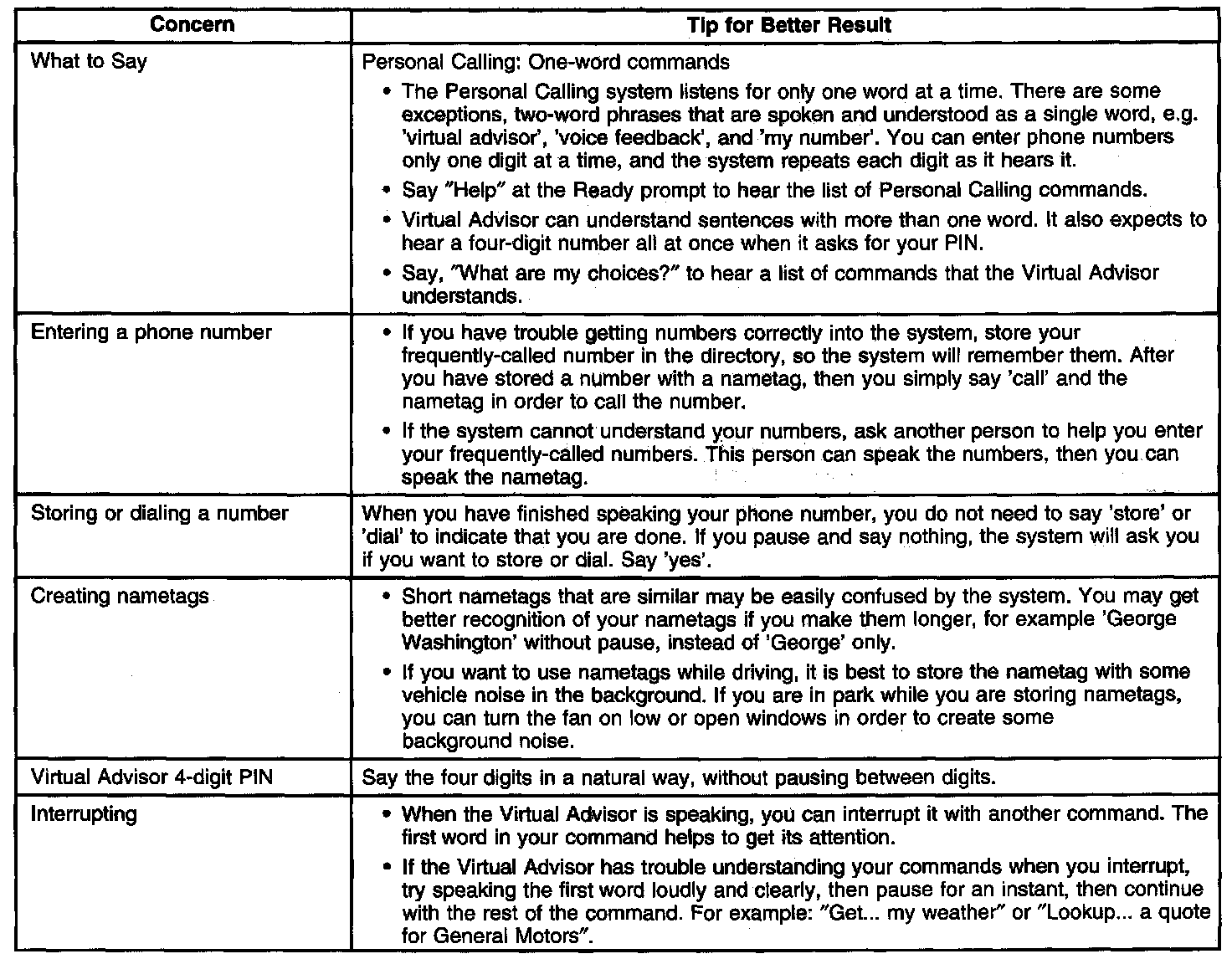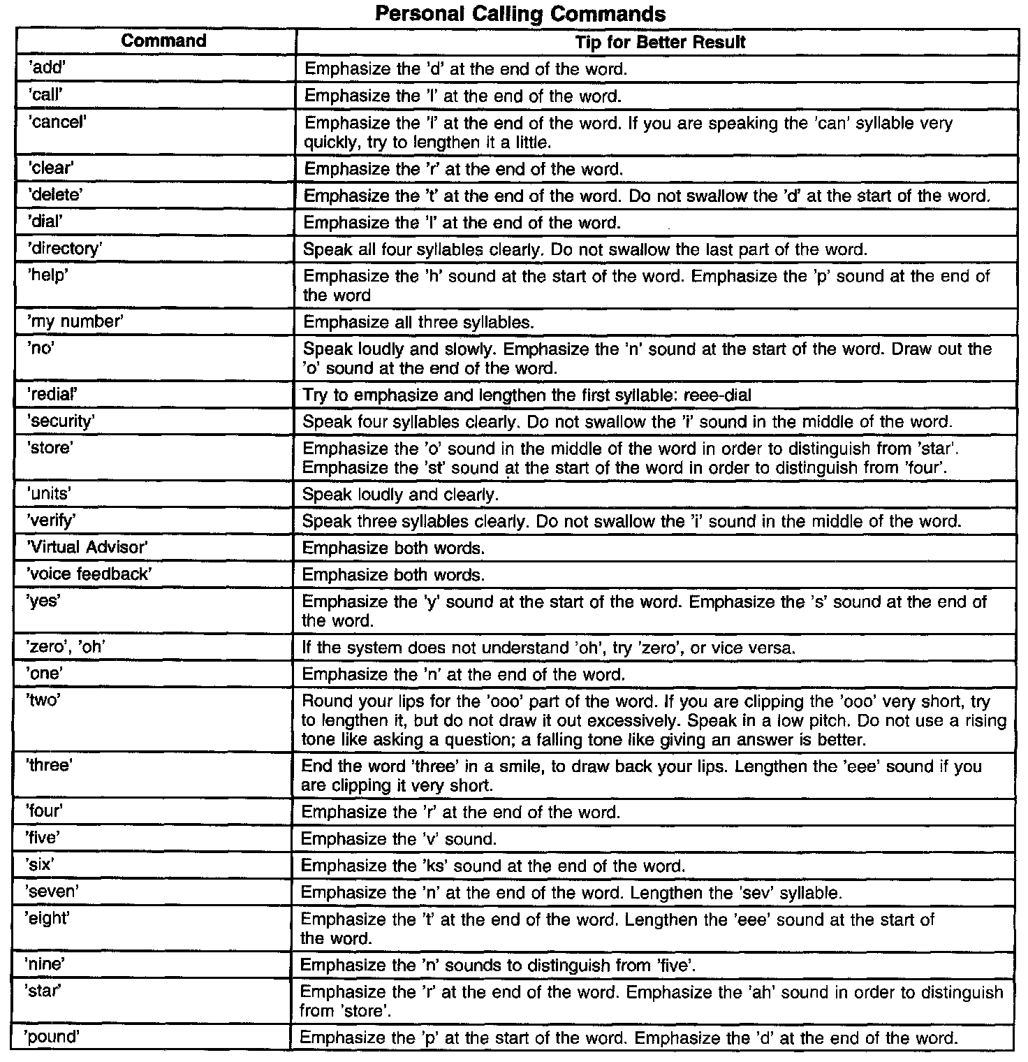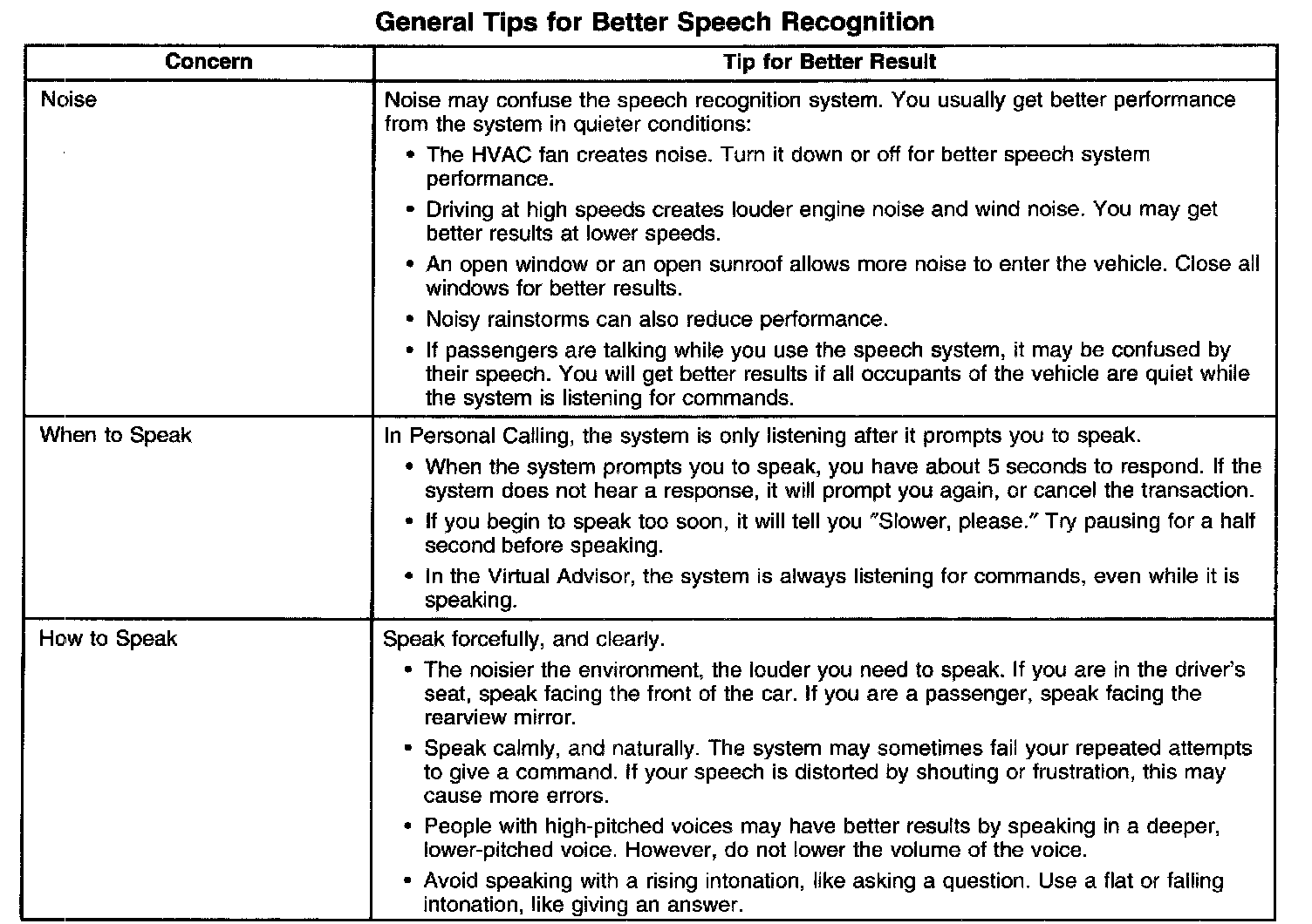The OnStar(R) speech recognition systems use speech technology that is designed to understand a wide range of American English speakers. Although there is no one right way to speak English, the system will work best when users try to modify their pronunciation should they encounter difficulty. Users who do not obtain good results are advised to try the tips and workarounds found.