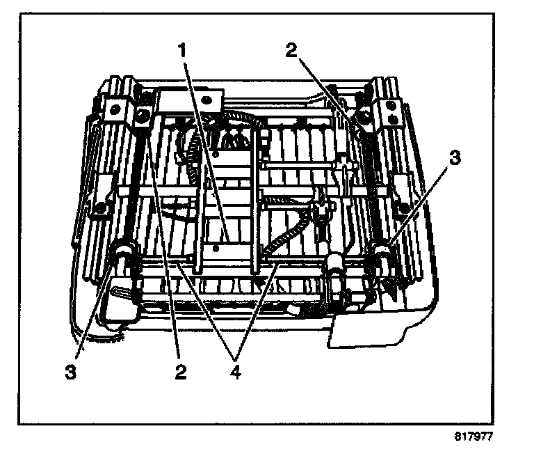 2. Using the power seat switch, run the seat adjuster rearward until the drive bracket (3) and the anchor bracket (2) are together on either side of the adjuster.