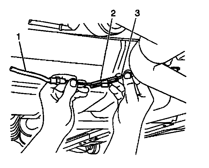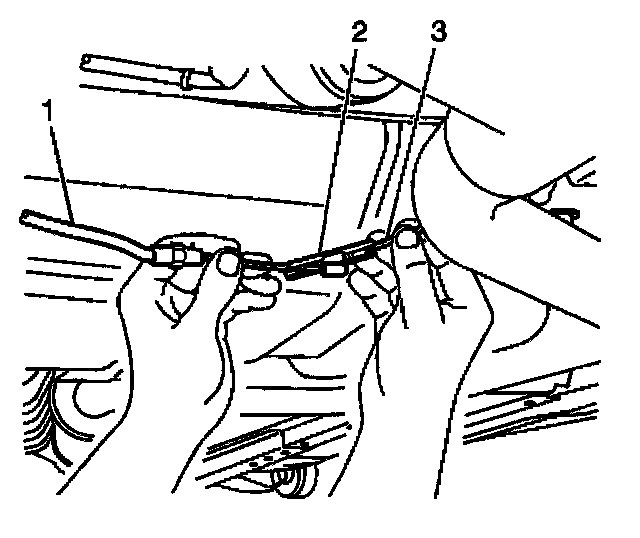 6. Disconnect the front cable (1) from the rear cable (3) at the connector clip (2).