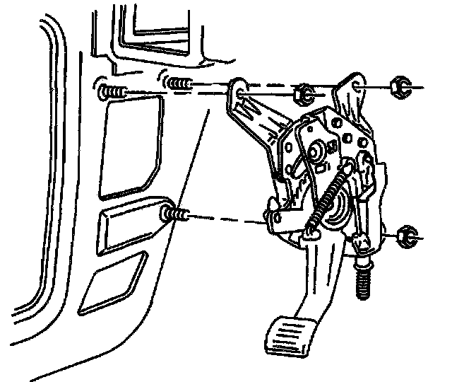 9. Remove the 3 park brake pedal assembly retaining nuts from the body mounting studs.