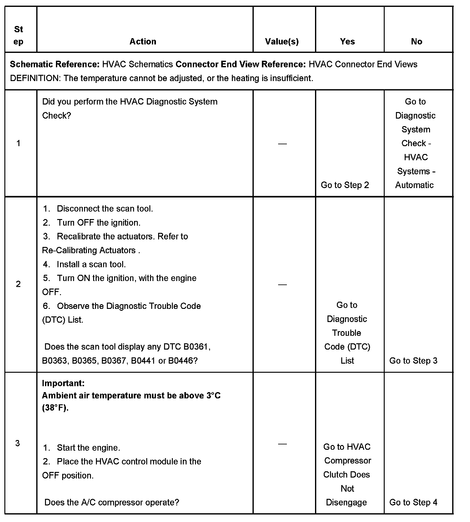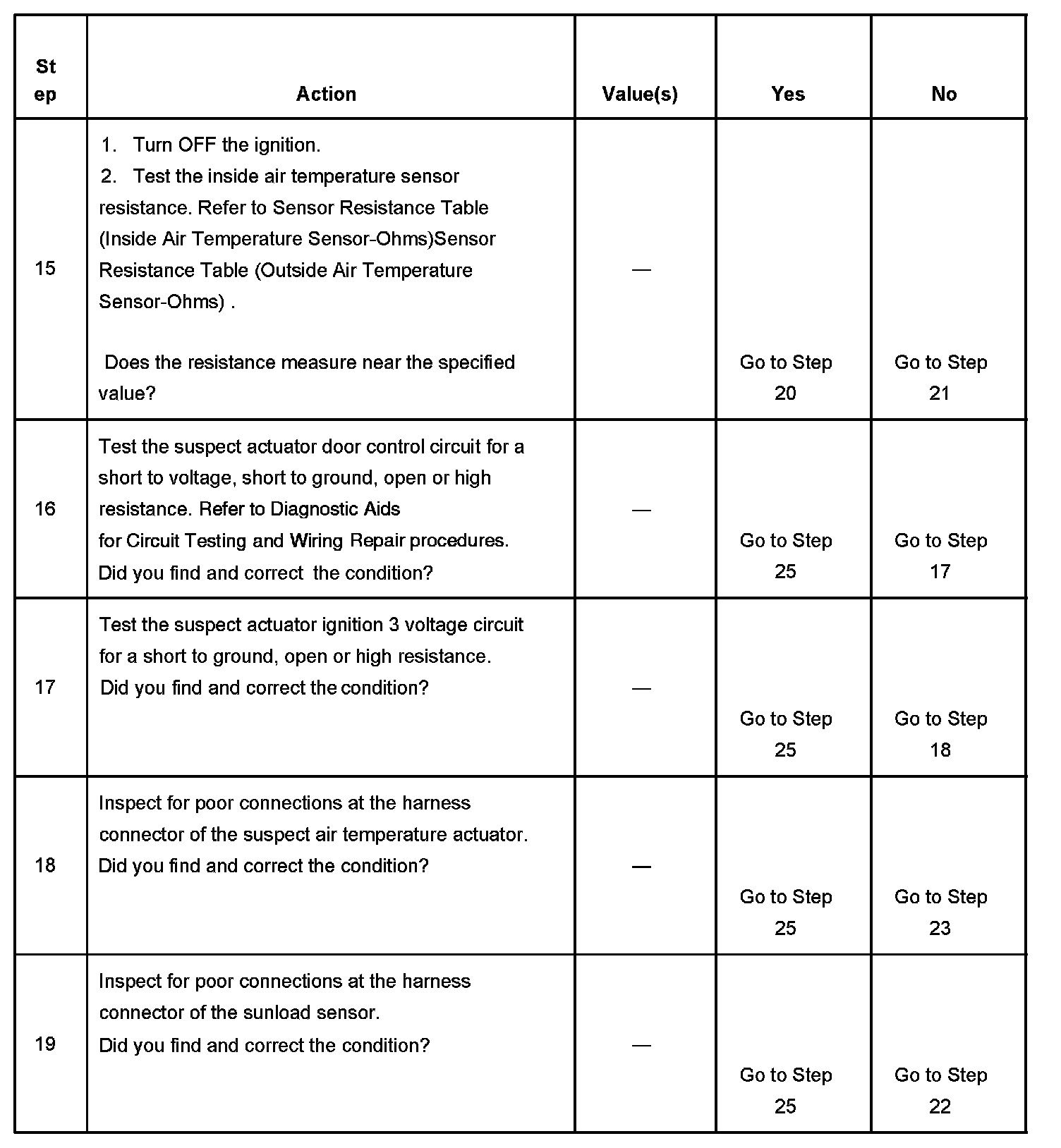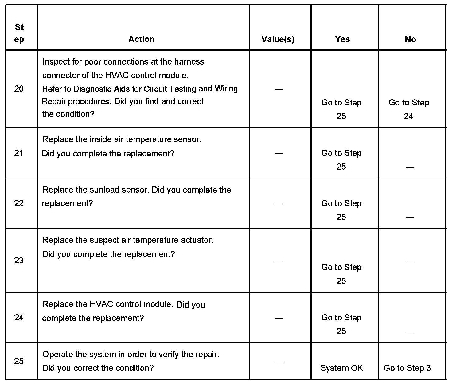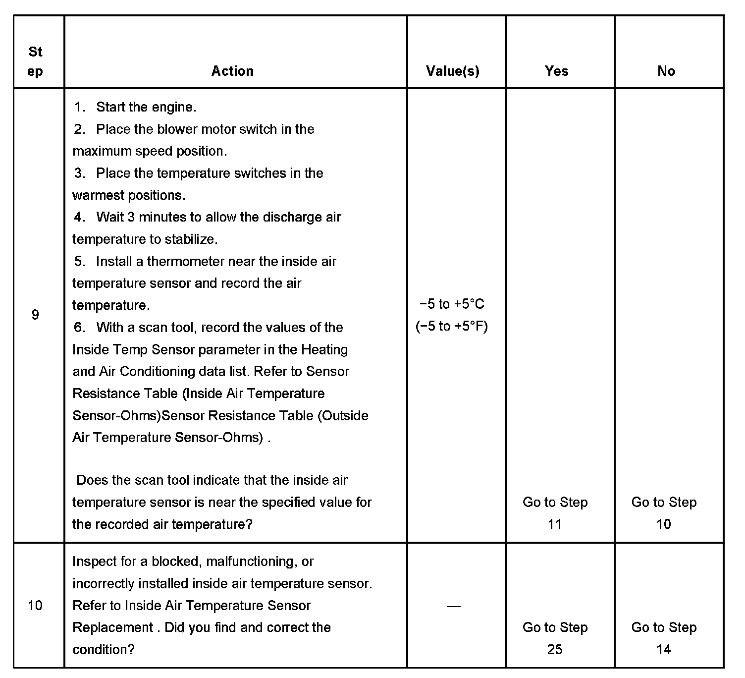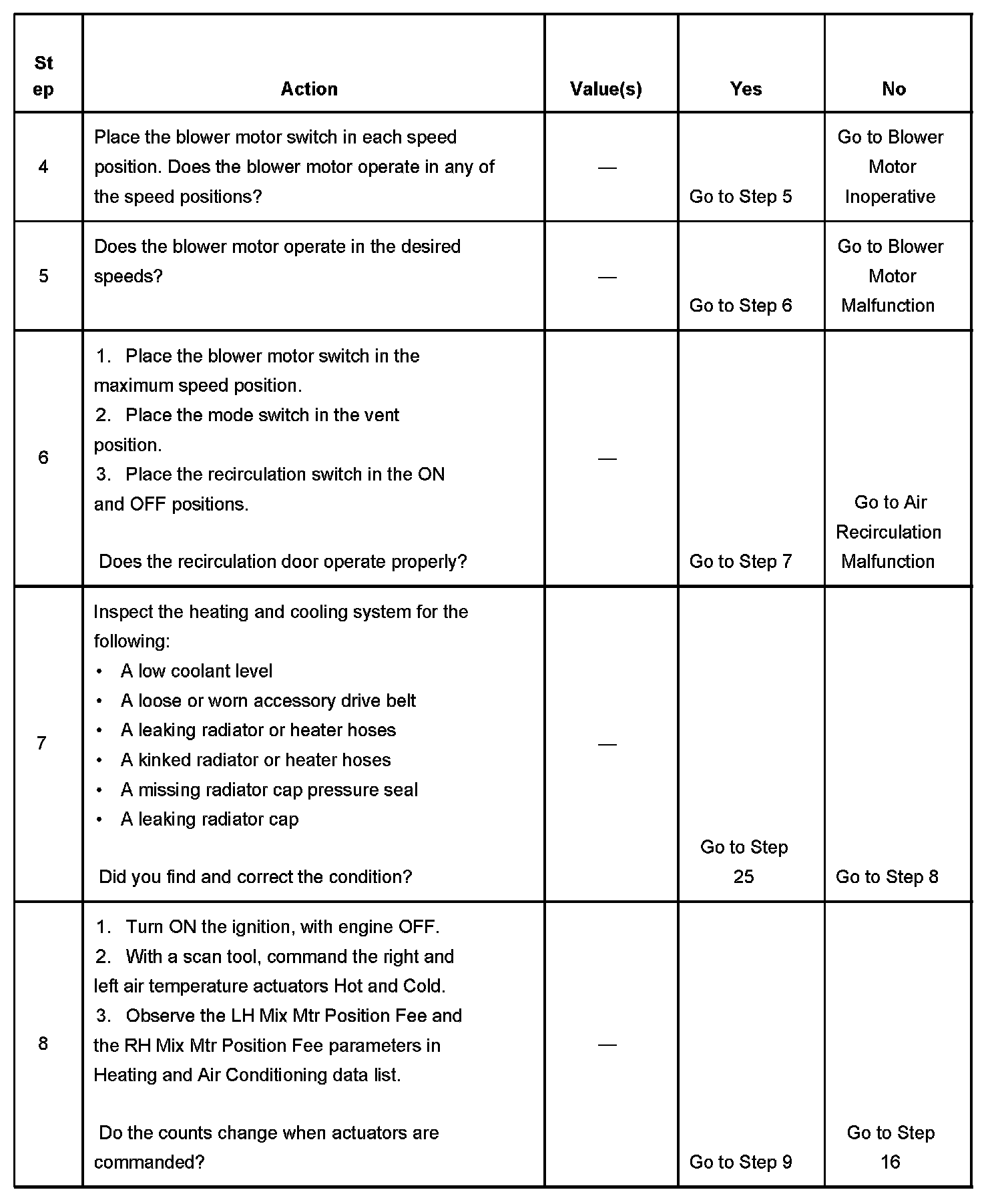 The numbers below refer to the step numbers on the diagnostic table.