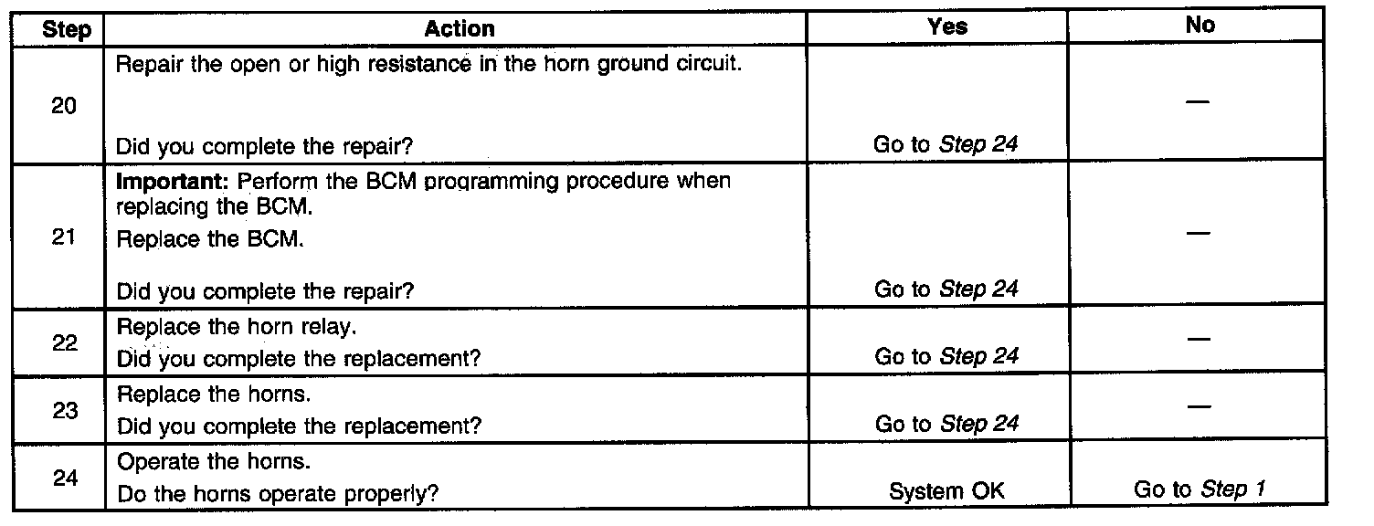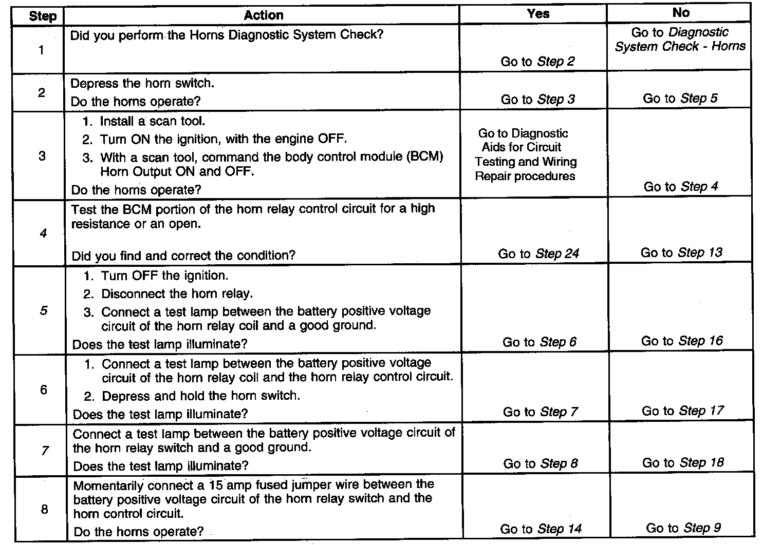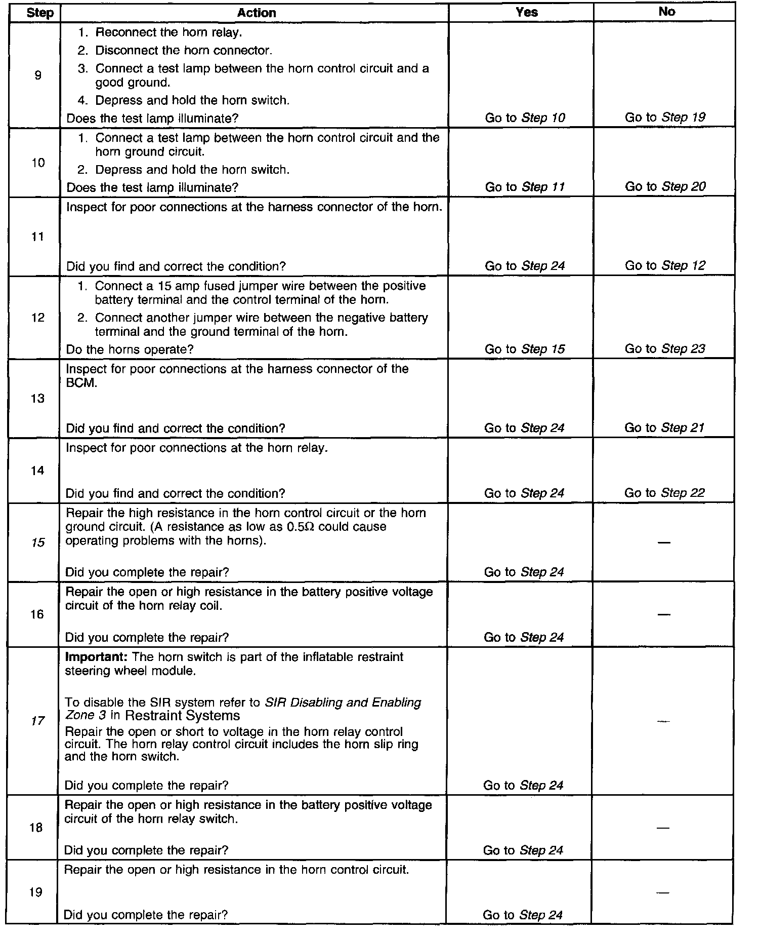 17. The horn relay control circuit includes the horn slip ring and the horn switch. The horn switch is part of the inflatable restraint steering wheel module. The horn slip ring and the horn switch must be tested for a high resistance, an open or a short to voltage when testing the relay control circuit.