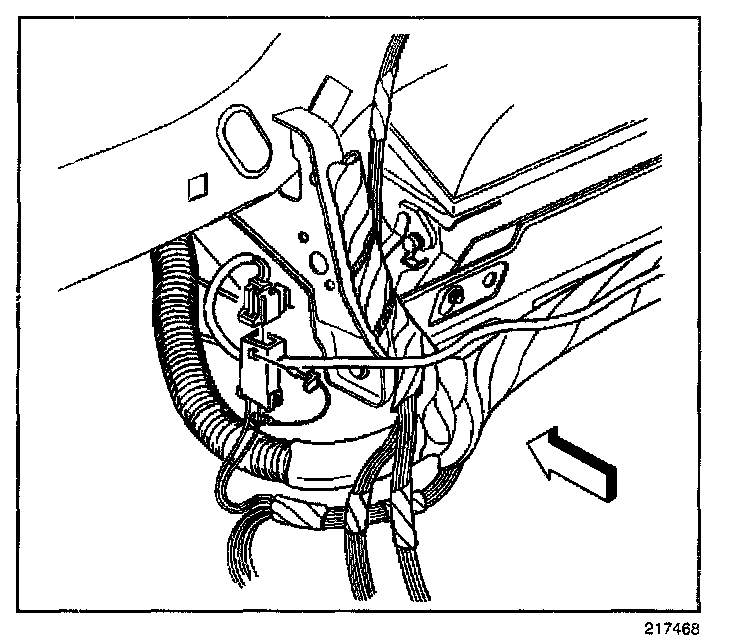 7. Remove the connector position assurance (CPA) from the inflatable restraint I/P module connector located to the right of the steering column.