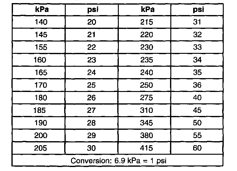 Inflation Pressure Conversion (Kilopascals to PSI)