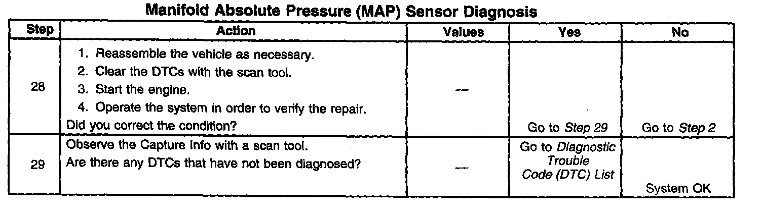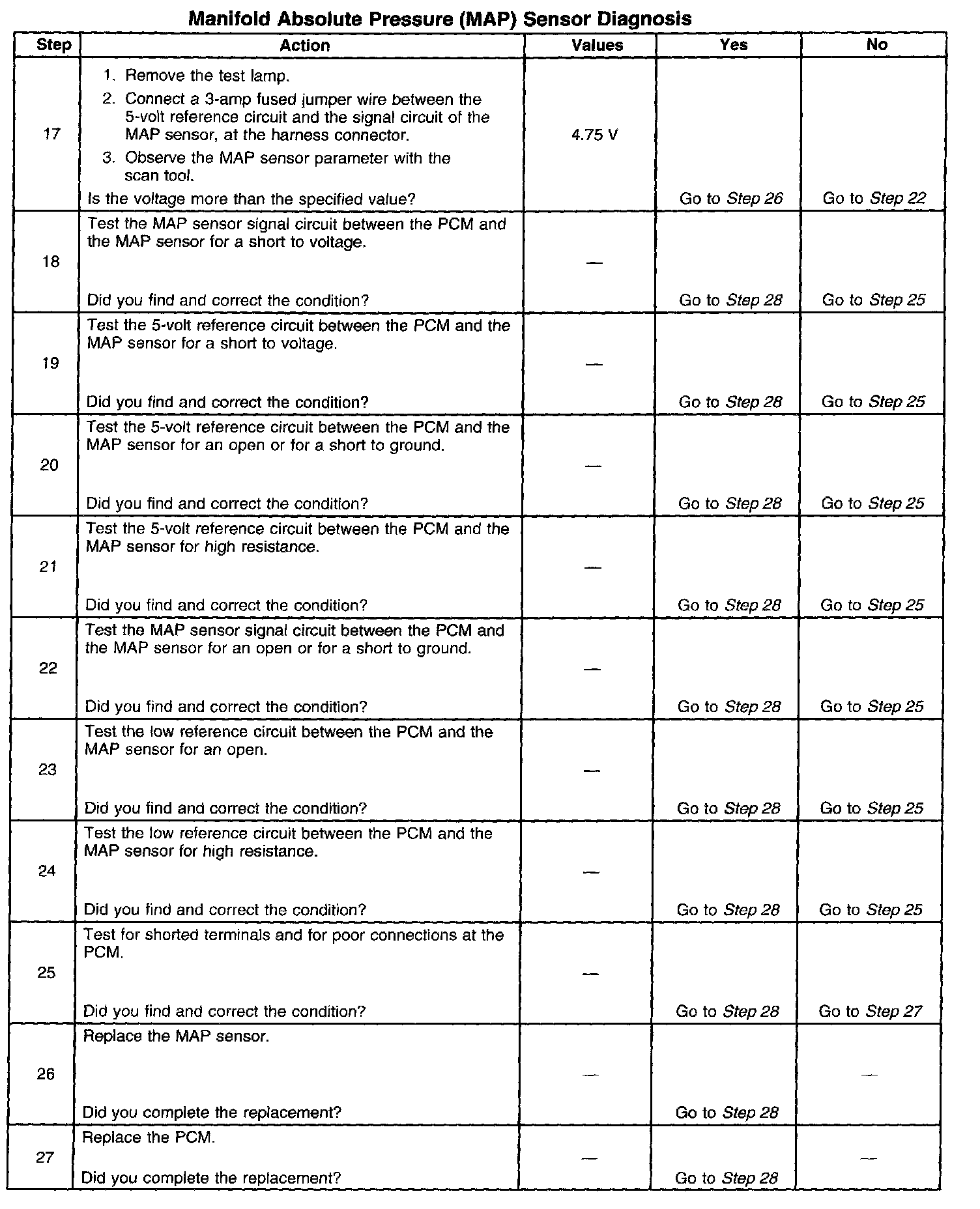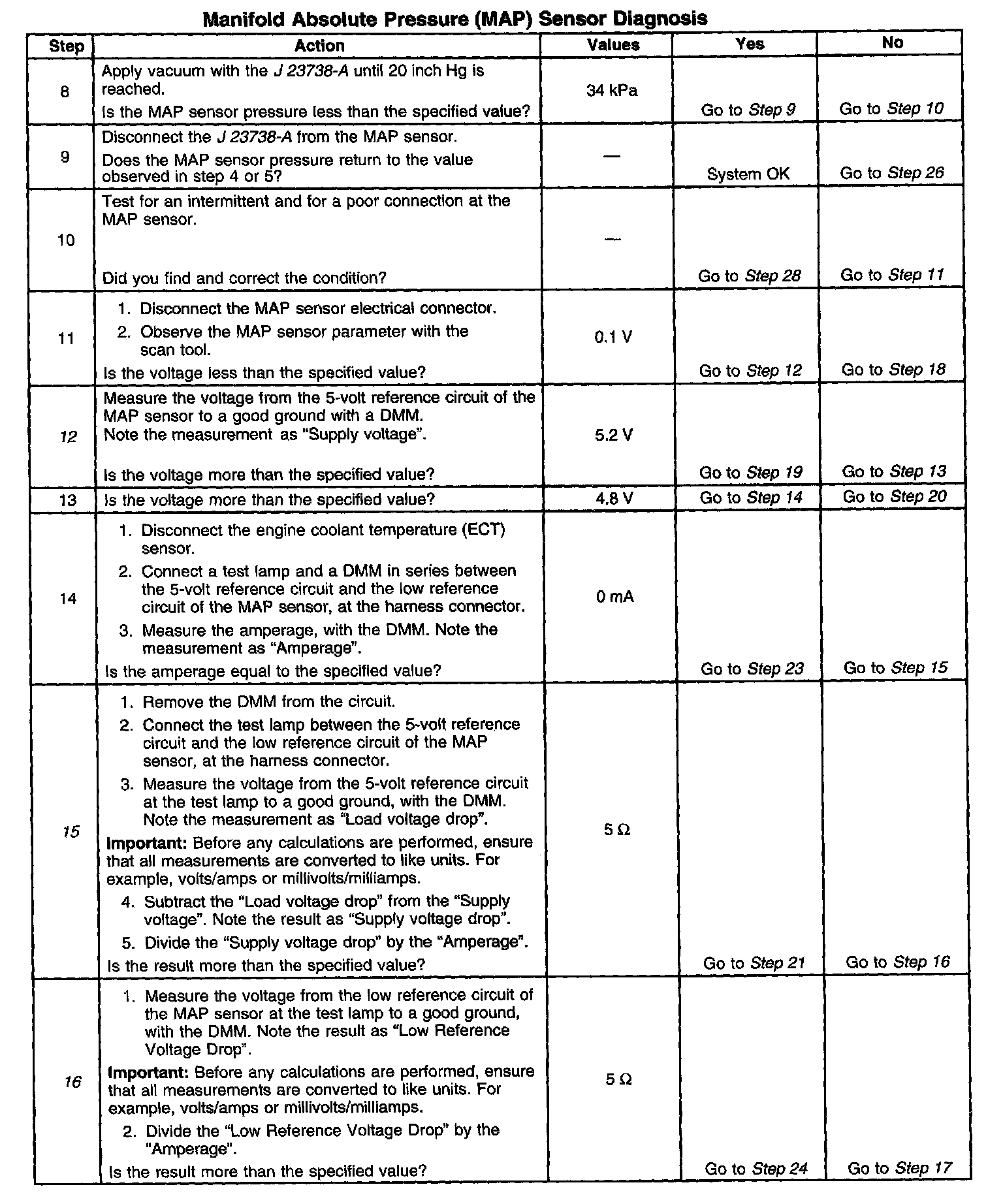 The manifold absolute pressure (MAP) sensor responds to changes in intake manifold pressure which gives an indication of the engine load. The MAP sensor has a 5-volt reference circuit, a low reference circuit, and a signal circuit. The powertrain control module (PCM) supplies 5 volts to the MAP sensor on the 5-volt reference circuit and provides a ground on the low reference circuit. The MAP sensor provides a signal to the PCM on the MAP sensor signal circuit, which is relative to the pressure changes in the manifold. With low MAP, such as during idle or deceleration, the PCM should detect a low MAP sensor signal voltage. With high MAP, such as ignition ON, engine OFF, or wide open throttle (WOT), the PCM should detect a high MAP sensor signal voltage. This MAP sensor will indicate pressure between 10-104 kPa. The MAP sensor is also used in order to calculate the barometric pressure (BARO) when the ignition switch is turned ON, with the engine OFF. The BARO reading may also be updated whenever the engine is operated at WOT. The PCM monitors the MAP sensor signal for voltage outside of the normal range. If the PCM detects a MAP sensor signal voltage that is excessively low, DTC P0107 sets. If the PCM detects a MAP sensor signal voltage that is excessively high, DTC P0108 sets.