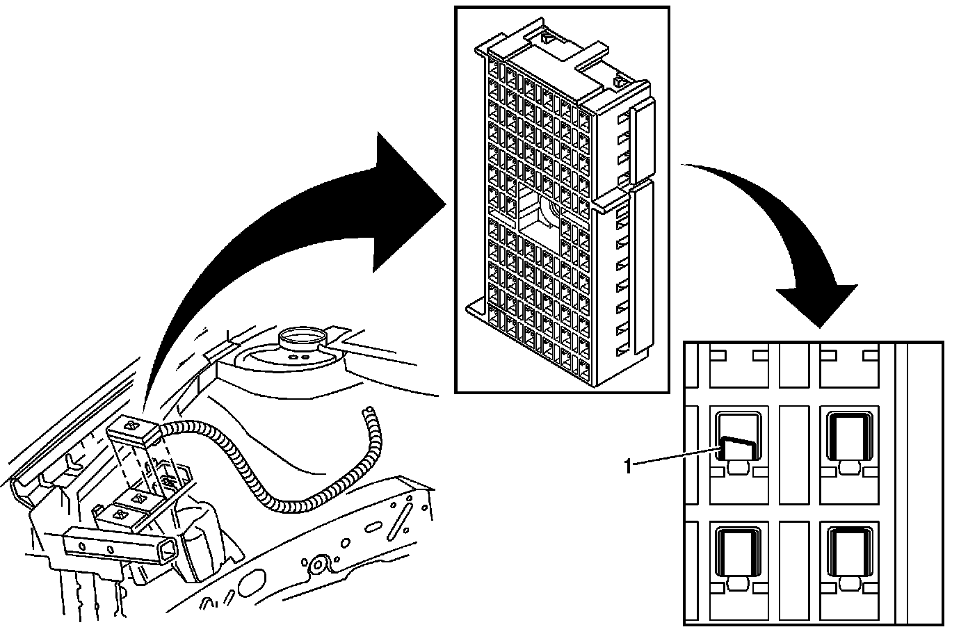 1. Remove the Underhood Electrical Center/Engine Wiring Junction Block base assembly. Refer to the Underhood Electrical Center or Junction Block Replacement procedure in the Wiring Systems sub-section of the Service Manual.