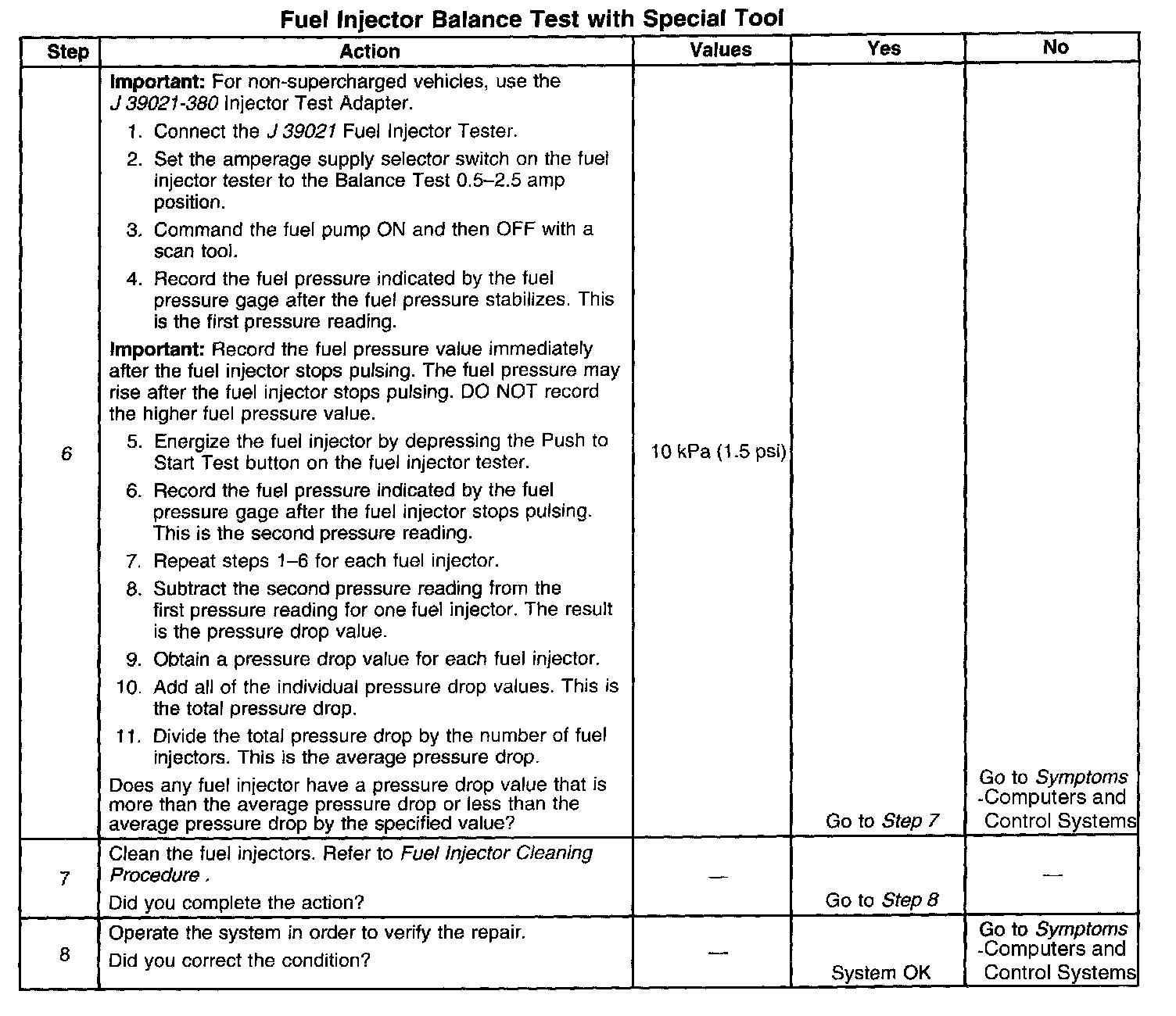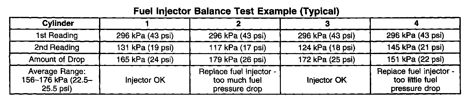 6. If the pressure drop value for each fuel injector is within 10 kPa (1.5 psi) of the average pressure drop value, the fuel injectors are flowing properly.