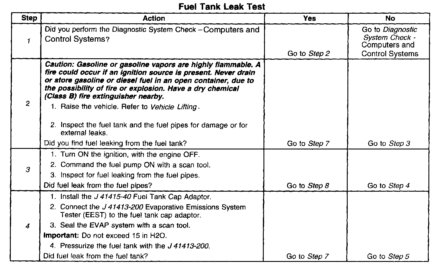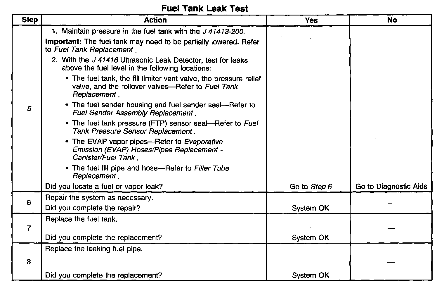 The fuel tank leak test is used to locate any fuel or fuel vapor escaping the fuel tank area. Fuel vapors escaping above the fuel level will be detected when the evaporative emission (EVAP) diagnostics complete one test cycle. The malfunction indicator lamp (MIL) will illuminate after the EVAP diagnostics complete two test cycles.