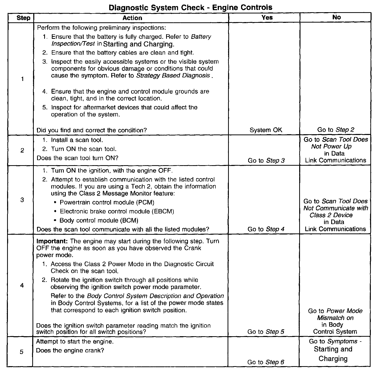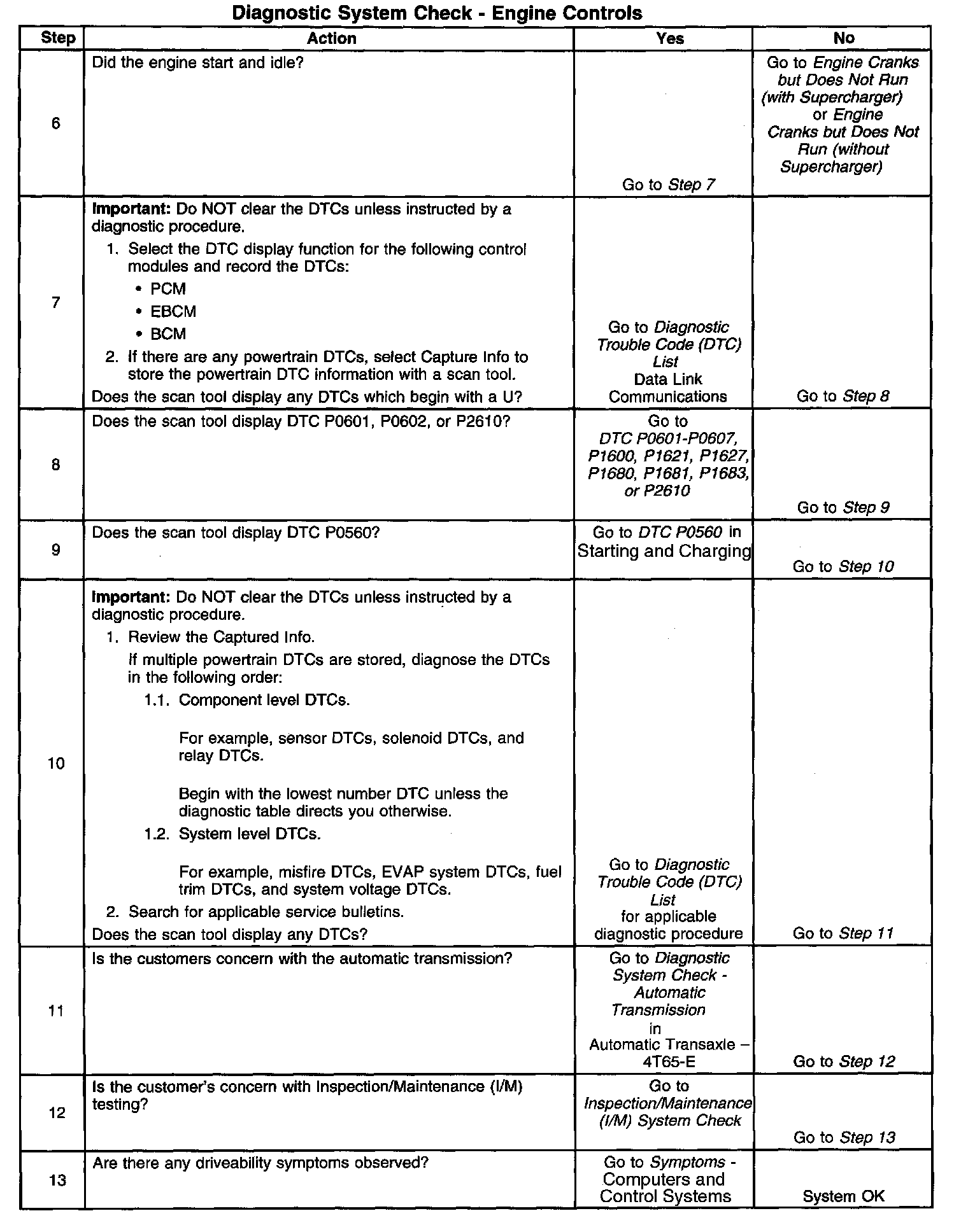 The Diagnostic System Check is an organized approach to identifying a condition created by an electronic engine control system malfunction. The Diagnostic System Check must be the starting point for any driveability concern. The Diagnostic System Check directs the service technician to the next logical step in diagnosing the concern. Understanding the table and using the table correctly reduces diagnostic time and prevents the replacement of good pans.