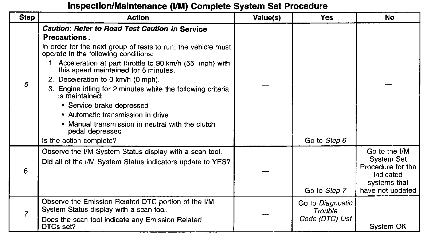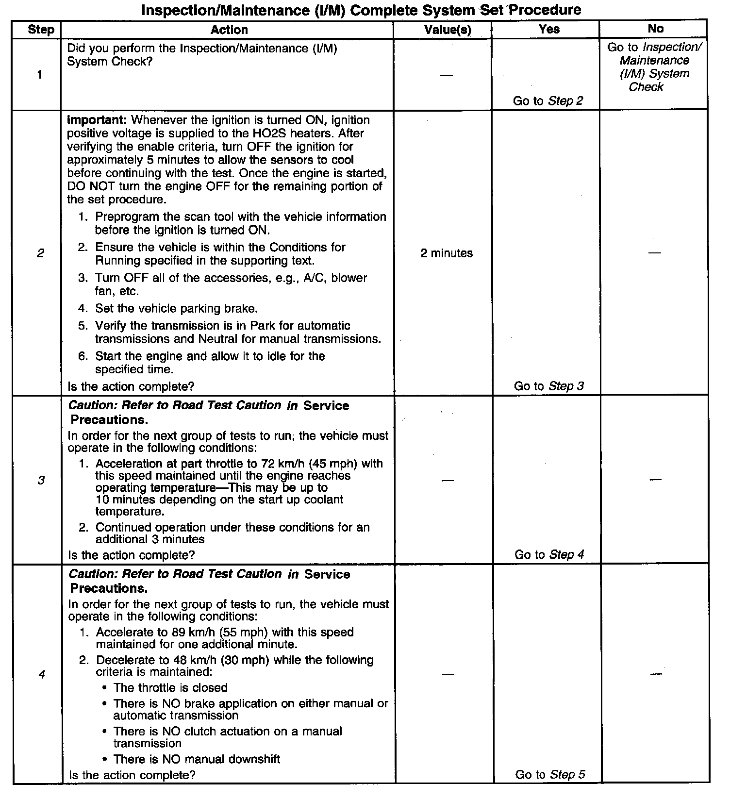 Rough road conditions may prevent some of the tests from running. Extreme high or tow ambient temperatures may prevent tests such as HO2S Heater and EVAP System from initiating. If a step is interrupted before completion, perform the remaining portion of the set procedures. Any portion of the set procedure that requires the engine at operating temperature may be repeated. This allows most of the diagnostics to run and the remaining tests can be performed using the individual System Set Procedures. The scan tool can be used to monitor each of the I/M System Status indicators during the I/M complete system set procedure. When all of the indicators for a test step have updated to YES, testing can move on to the next step even if the remaining portion of the test is not complete. For example, step 3 is designed to run the EVAP, AIR, and HO2S tests. The procedure instructs the technician to operate the vehicle in the enable conditions for 6 minutes. It all 3 tests have updated to YES within 4 minutes, it is not necessary to continue with the enable conditions and testing can advance to the next step.