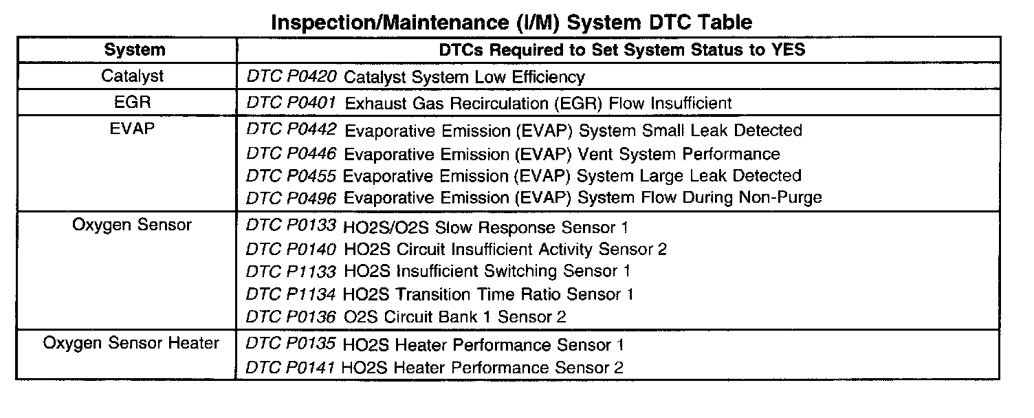 Inspection/Maitenance (I/M) System (DTC) Table