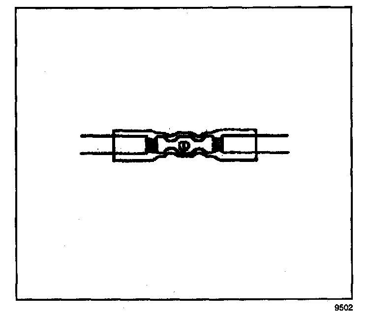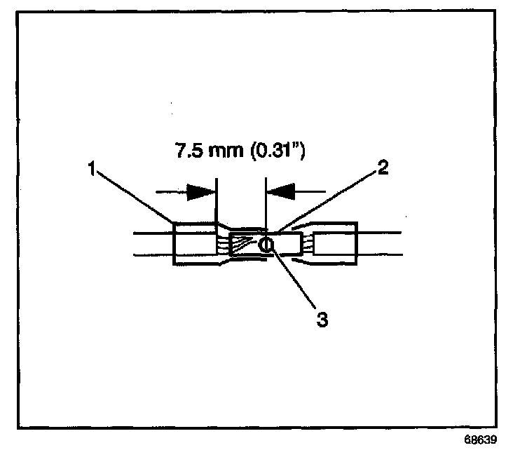 6. Place the splice sleeve in the nest. Ensure that the crimp falls midway between the end of the barrel and the stop. The sleeve has a stop (3) in the middle of the barrel (2) in order to prevent the wire (1) from going further. Close the hand crimper handles slightly in order to firmly hold the splice sleeve in the proper nest.