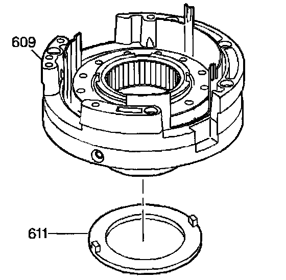1. Use J 36850 or equivalent in order to secure the second clutch housing thrust washer (611) to the driven sprocket support assembly (609).