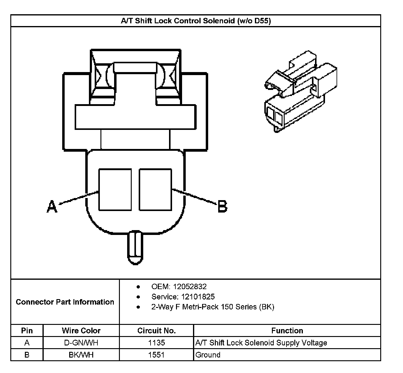 A/T Shift Lock Control Solenoid (w/o D55) Connector End View: