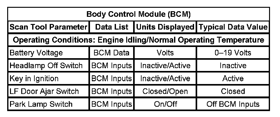 Scan Tool Data List - Body Control Module (BCM)