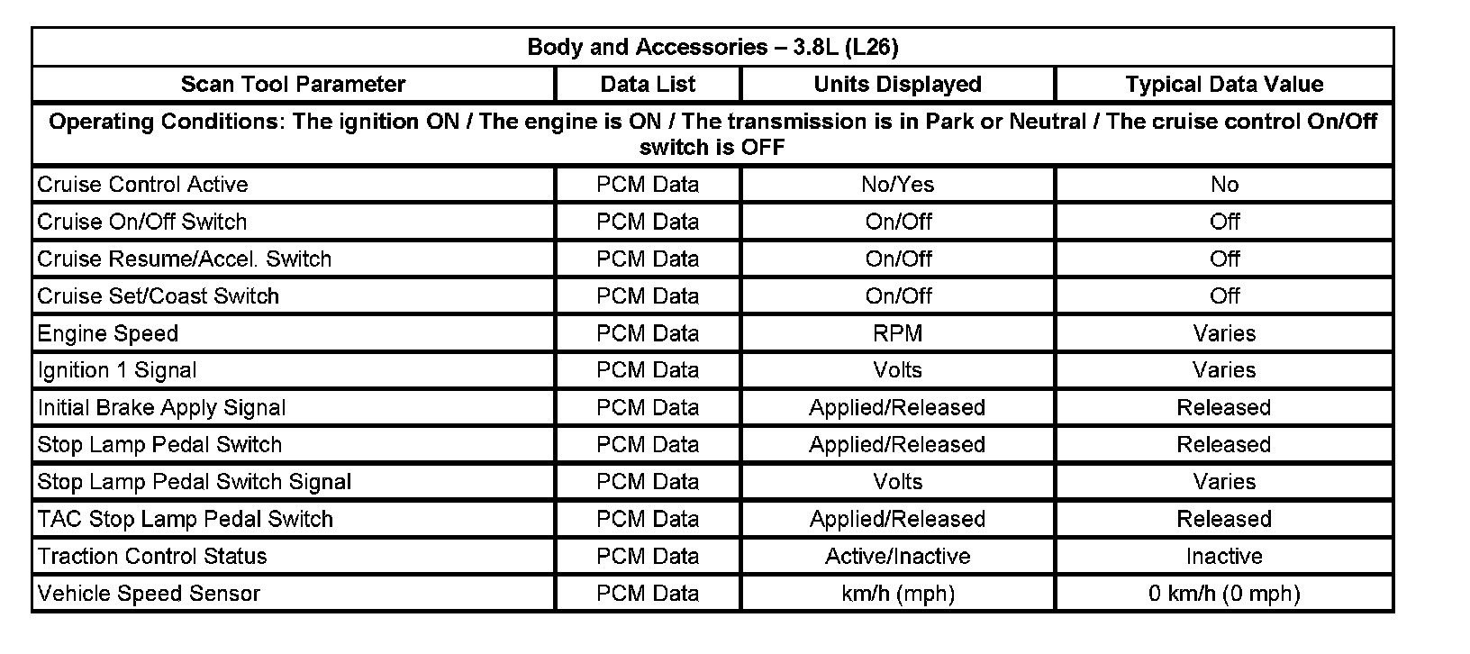 The scan tool data lists contain all of the cruise control related parameters that are available on the scan tool. The parameters in the list are arranged in alphabetical order. The data list column indicates the location of the parameter within the scan tool menu selections.