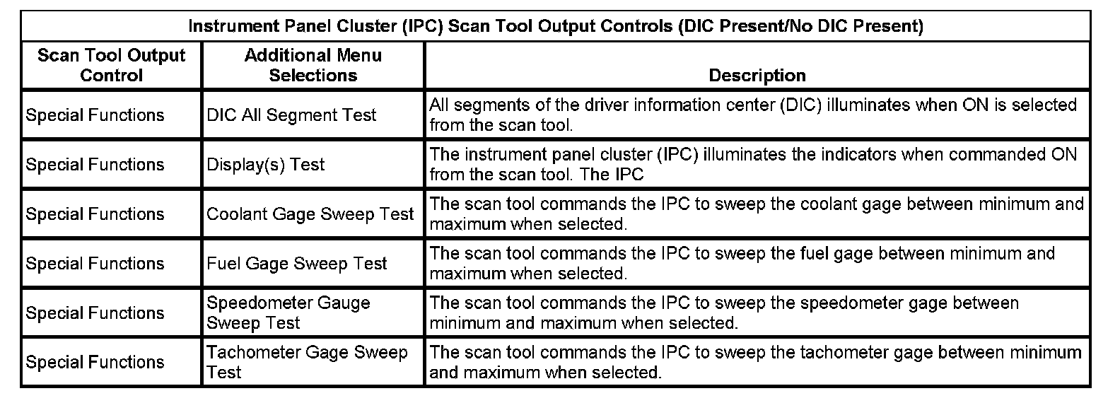 Instrument Panel Cluster (IPC) Scan Tool Output Controls (DIC Present/No DIC Present):