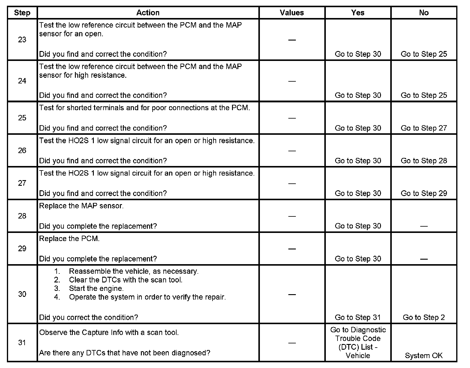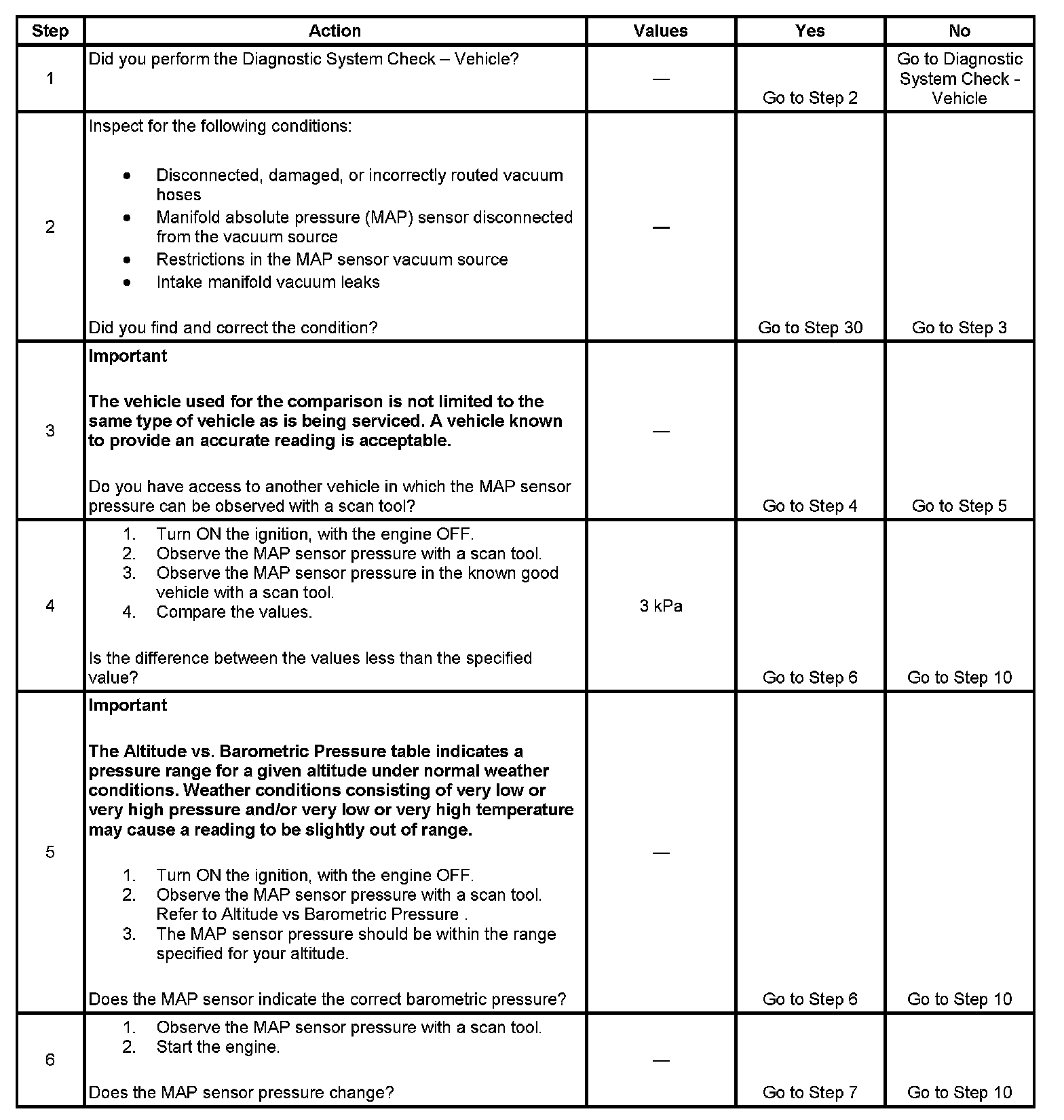 The manifold absolute pressure (MAP) sensor responds to changes in intake manifold pressure which gives an indication of the engine load. The MAP sensor has a 5-volt reference circuit, a low reference circuit, and a signal circuit. The powertrain control module (PCM) supplies 5 volts to the MAP sensor on the 5-volt reference circuit and provides a ground on the low reference circuit. The MAP sensor provides a signal to the PCM on the MAP sensor signal circuit, which is relative to the pressure changes in the manifold. With low MAP, such as during idle or deceleration, the PCM should detect a low MAP sensor signal voltage. With high MAP, such as ignition ON, engine OFF or wide open throttle (WOT), the PCM should detect a high MAP sensor signal voltage. The MAP sensor is also used in order to calculate the barometric pressure (BARO) when the ignition switch is turned ON, with the engine OFF. The BARO reading may also be updated whenever the engine is operated at WOT. The PCM monitors the MAP sensor signal for voltage outside of the normal range. If the PCM detects a MAP sensor signal voltage that is excessively low, DTC P0107 sets. If the PCM detects a MAP sensor signal voltage that is excessively high DTC P0108 sets.