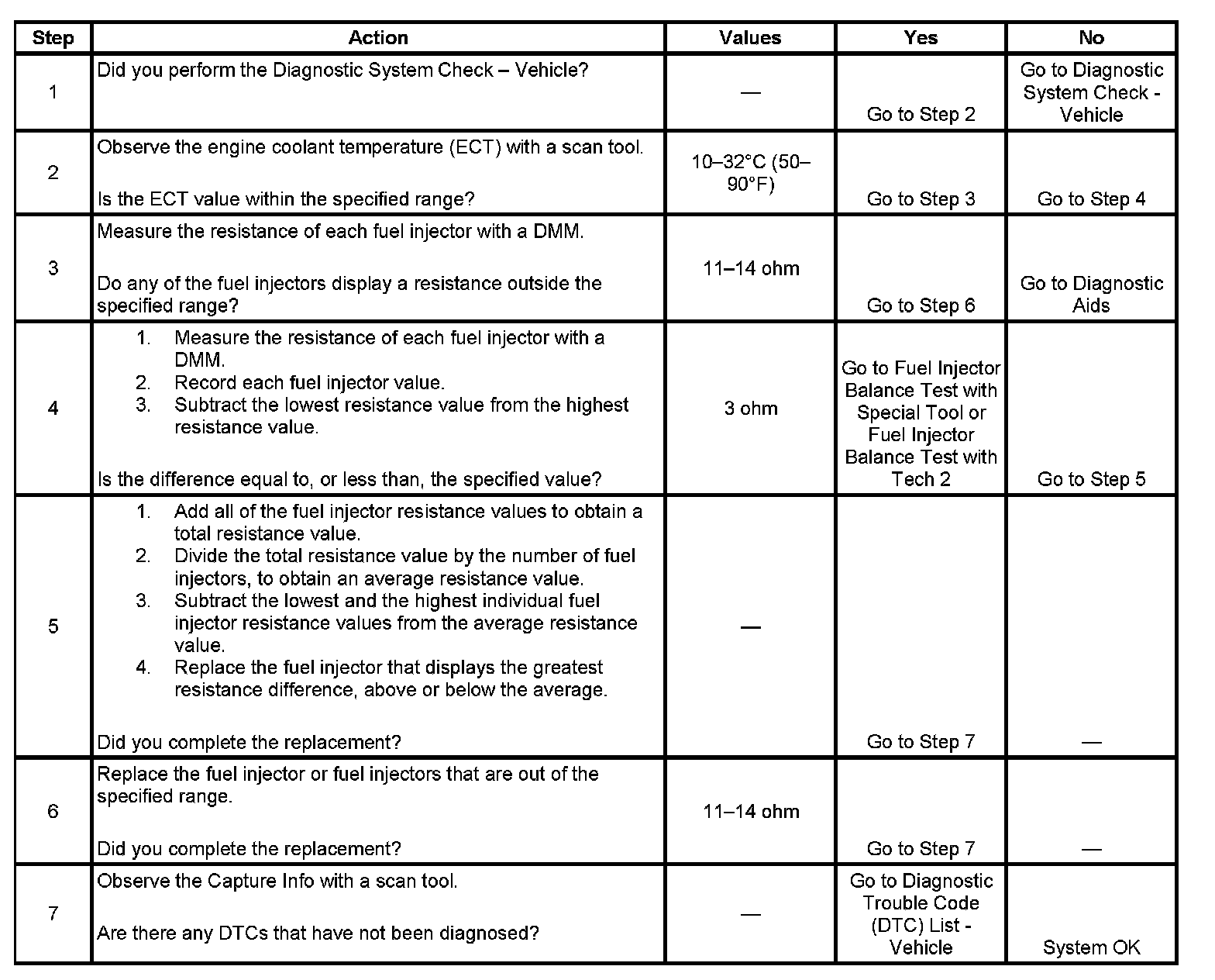 3. This step tests each fuel injector resistance within a specific temperature range. If any of the fuel injectors display a resistance outside of the specified value, replace the fuel injector.