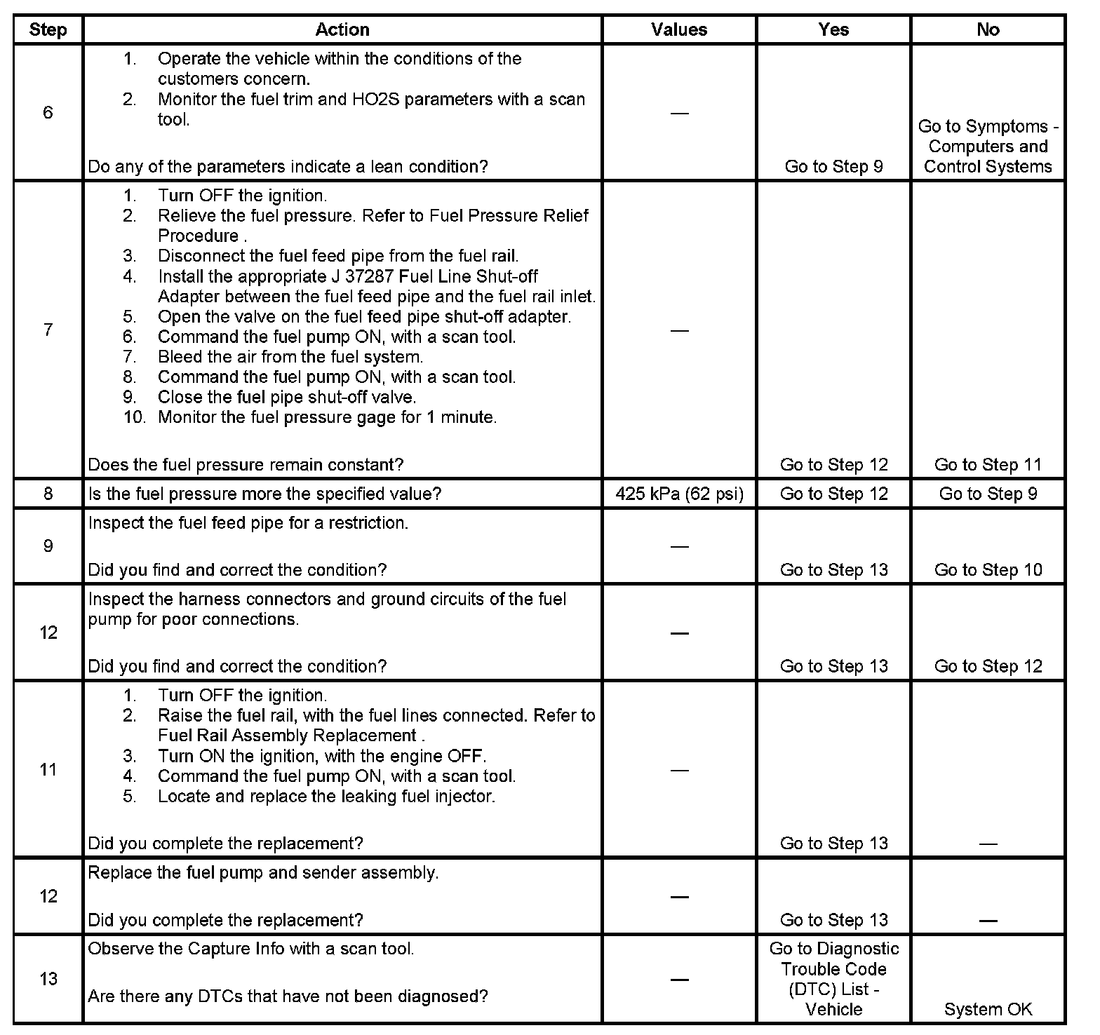 10. This step verifies that a circuit condition is not the cause of a fuel pressure concern. Inspect all fuel pump electrical circuits thoroughly.