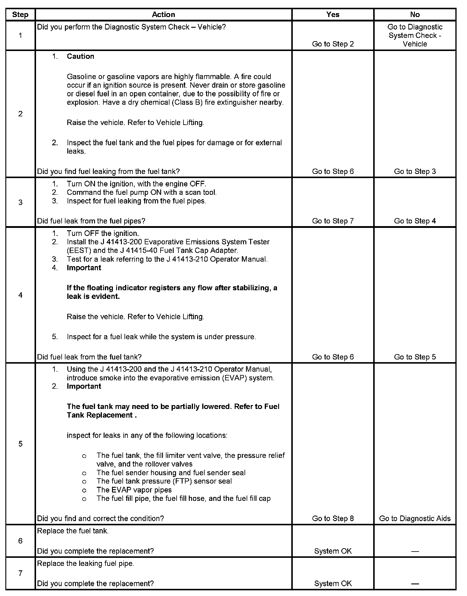 The fuel tank leak test is used to locate any fuel or fuel vapor escaping the fuel tank area. Fuel vapors escaping above the fuel level will be detected when the evaporative emission (EVAP) diagnostics complete one test cycle. The malfunction indicator lamp (MIL) will illuminate after the EVAP diagnostics complete two test cycles.