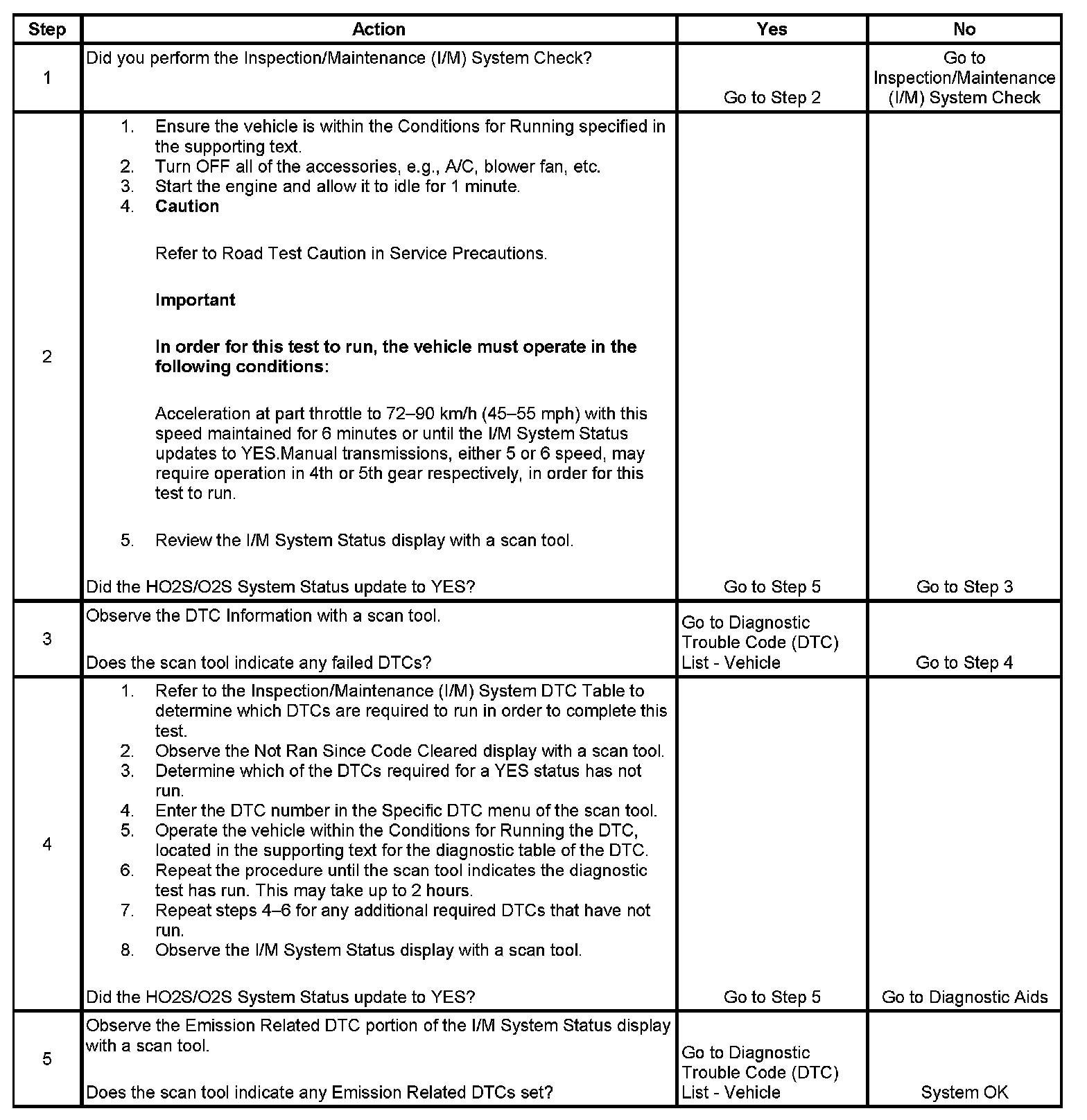 The purpose of this test is to satisfy the enable criteria necessary to execute inspection/maintenance (I/M) readiness diagnostics for the oxygen sensor (O2S, HO2S) system. The test may be used to set the I/M System Status to YES. The I/M System Status display on the scan tool provides an indication of whether the control module has completed the required tests. The I/M System Status does not indicate that the tests have passed or failed. When all of the diagnostics for a specific system have run and passed, the I/M System Status will update to YES. If a test for a specific system has failed, the I/M System Status will update to YES, indicating a determination was made, even if all of the other tests for that system have not run.