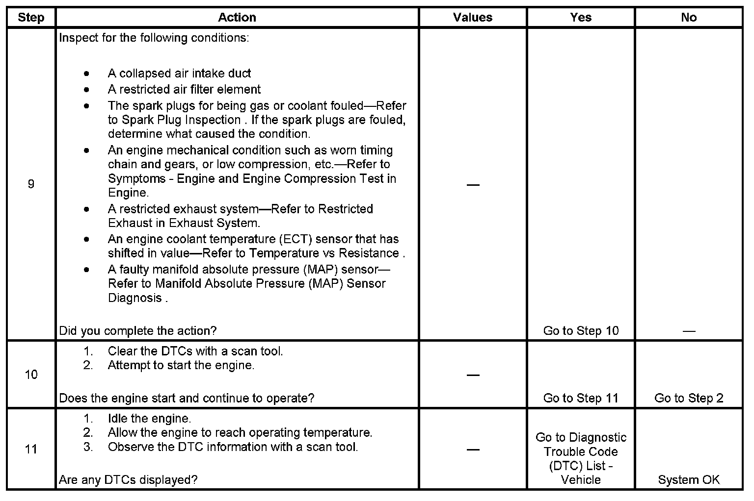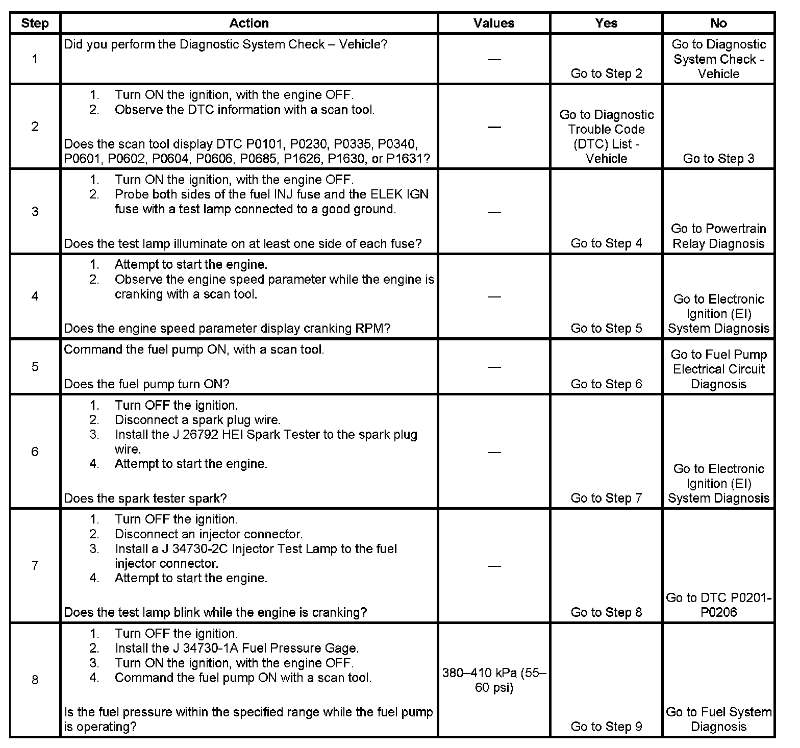 The Engine Cranks But Does Not Run diagnostic table assumes the following: