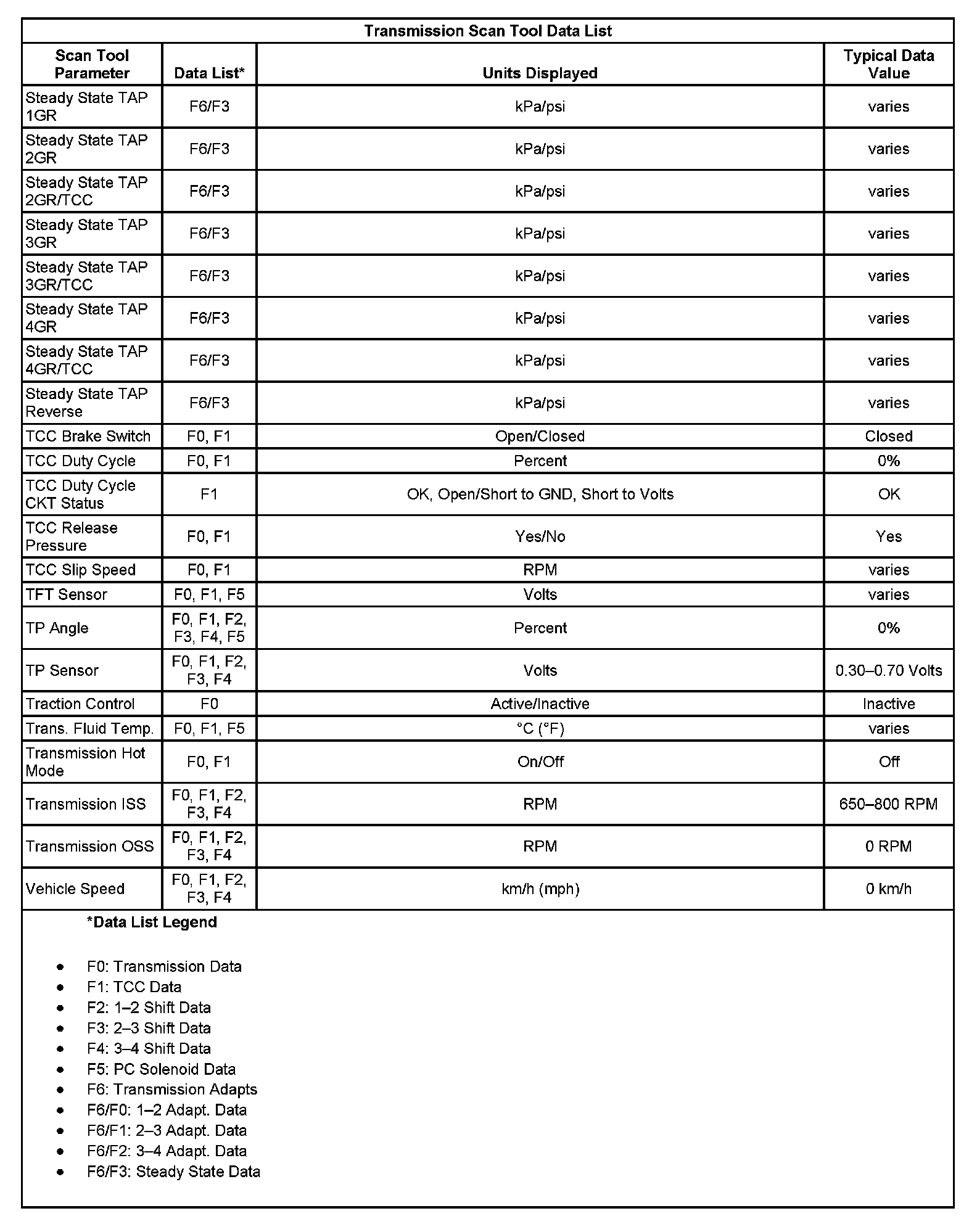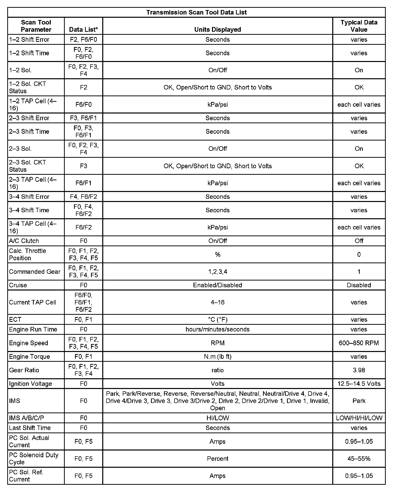 Transmission Scan Tool Data List