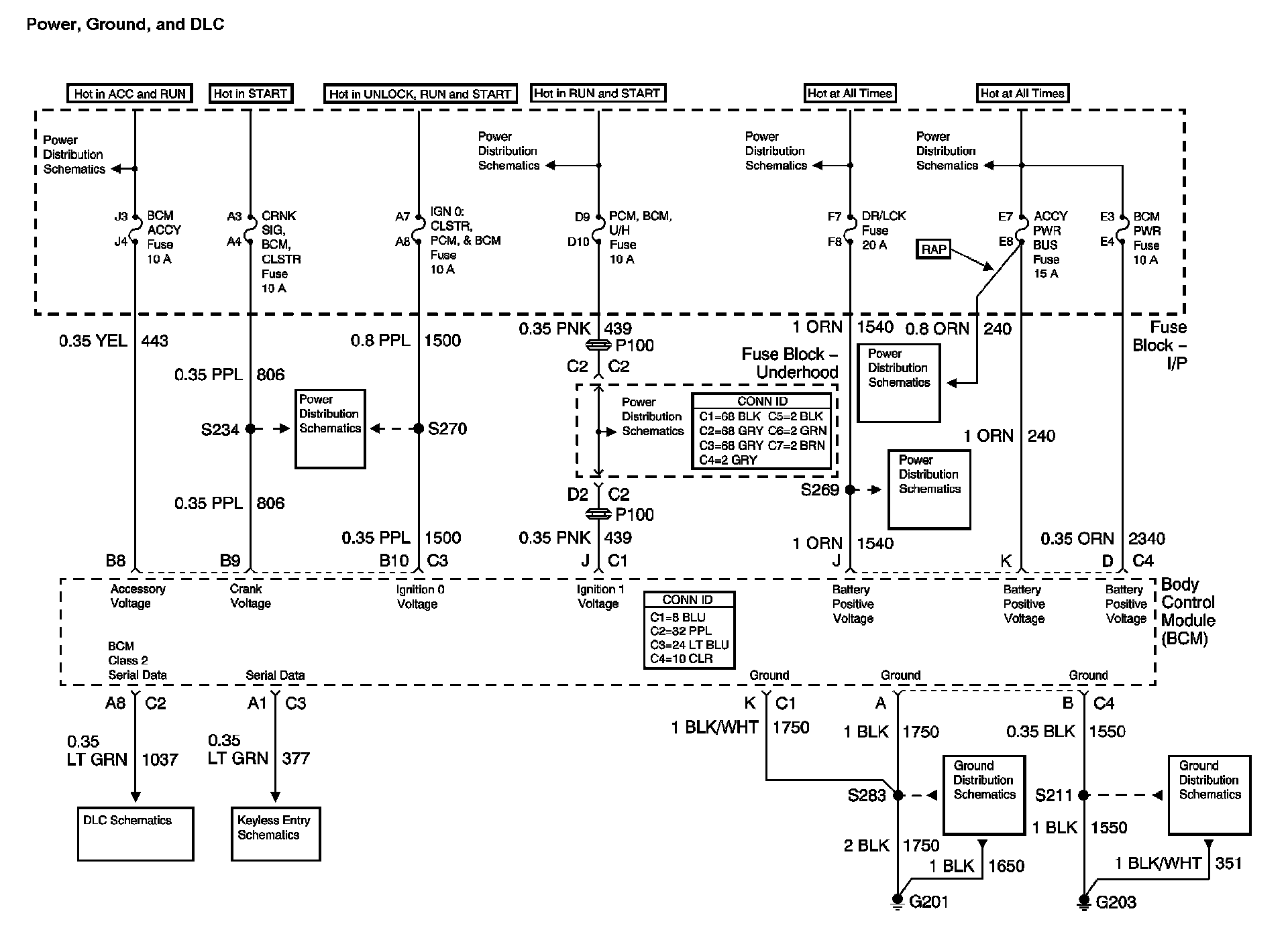 Location: The locations for the Connectors, Grounds, Splices, and Grommets shown within these diagrams can be found via their at Vehicle Locations. Locations