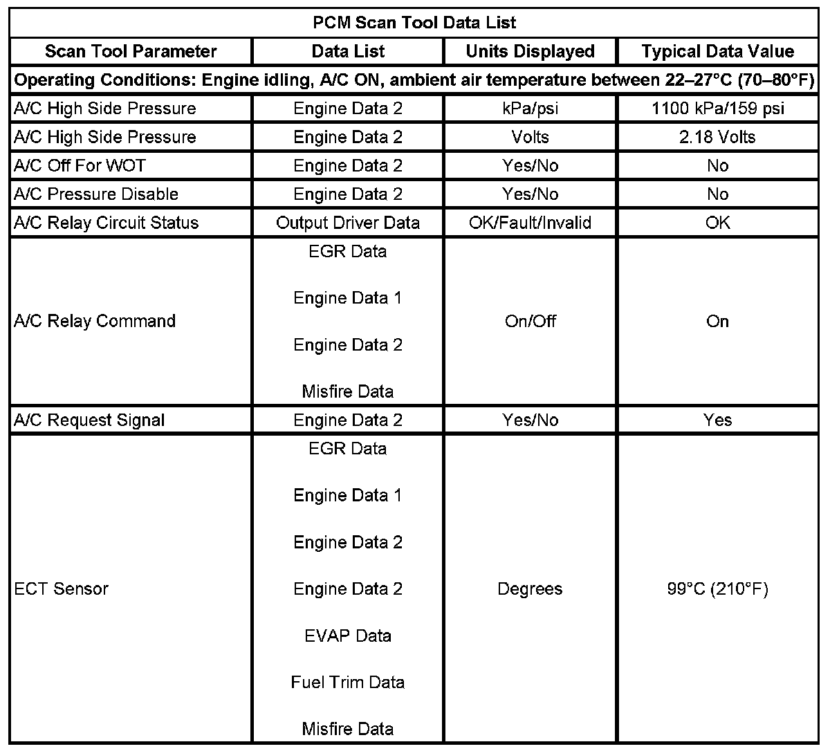 The scan tool data values were taken from a known good vehicle under the following conditions: