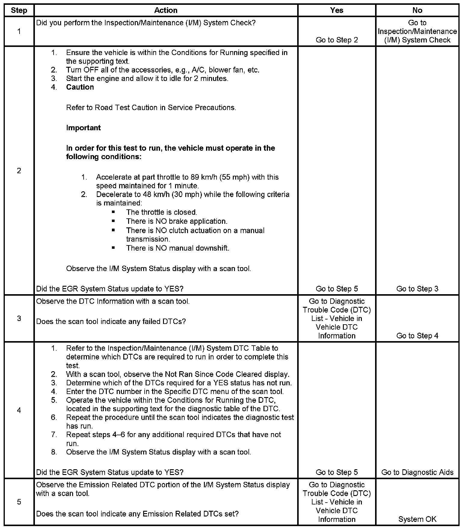 The purpose of this test is to satisfy the enable criteria necessary to execute inspection/maintenance (I/M) readiness diagnostics for the exhaust gas recirculation (EGR) system. The test may be used to set the I/M System Status indicators to YES. The I/M System Status display on the scan tool provides an indication of whether the control module has completed the required tests. The I/M System Status does not indicate that the tests have passed or failed. When all of the diagnostics for a specific system have run and passed, the I/M System Status will update to YES. If a test for a specific system has failed, the I/M System Status will update to YES, indicating a determination was made even if all of the other tests for that system have not run.