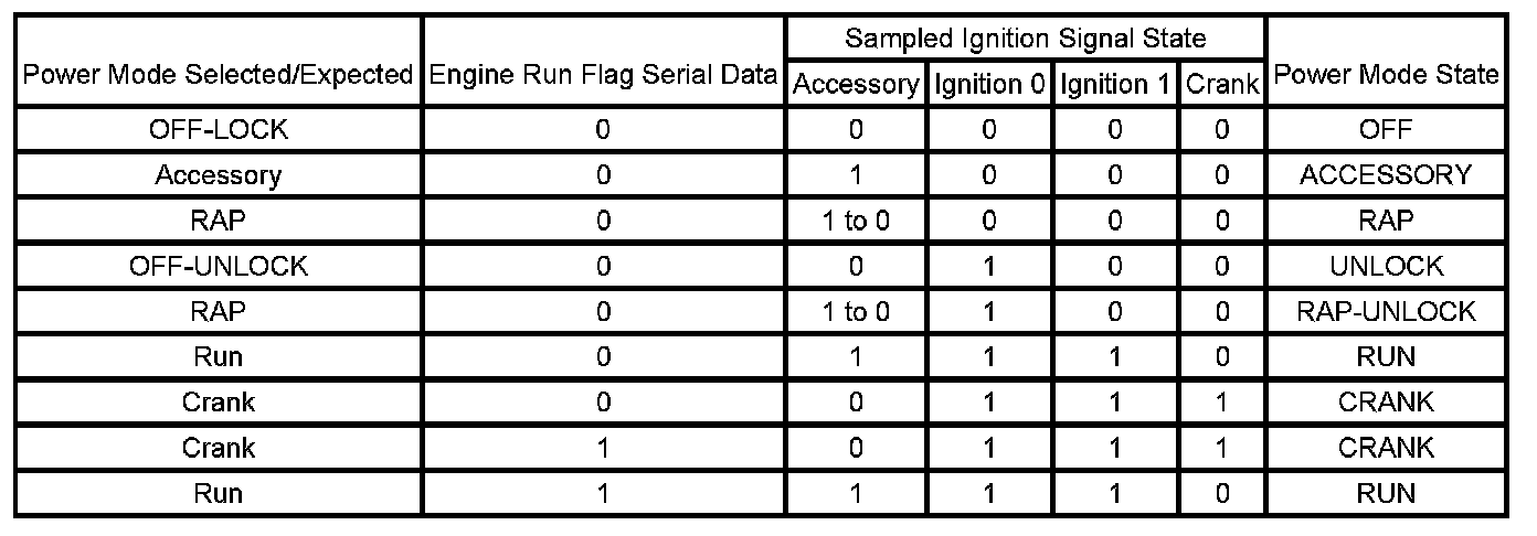 Those modules that have discrete ignition signal inputs also remain in the state dictated by the last valid BCM message received on the serial data circuits. They then check the state of their discrete ignition input to determine the current valid state. If the discrete ignition input is active, B+, the modules will fail-safe to the RUN power mode. If the discrete ignition input is not active, open or 0 voltage, the modules will fail-safe to OFF-AWAKE. In this state the modules are constantly checking for a change status message on the serial data circuits, and can respond to both local inputs, and serial data inputs from other modules on the vehicle.